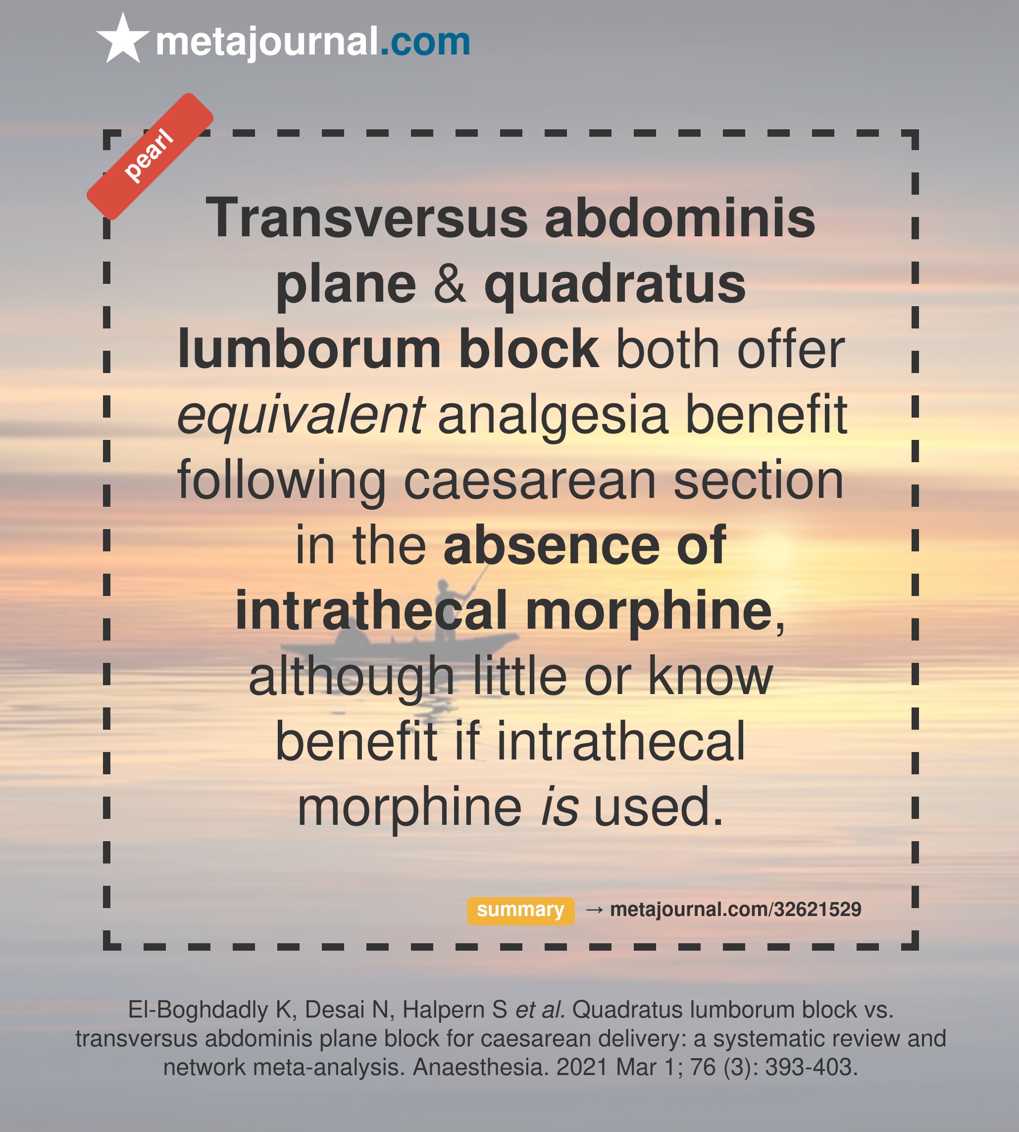 Quadratus lumborum block vs. transversus abdominis plane block for caesarean delivery: a systematic review and network meta-analysis.