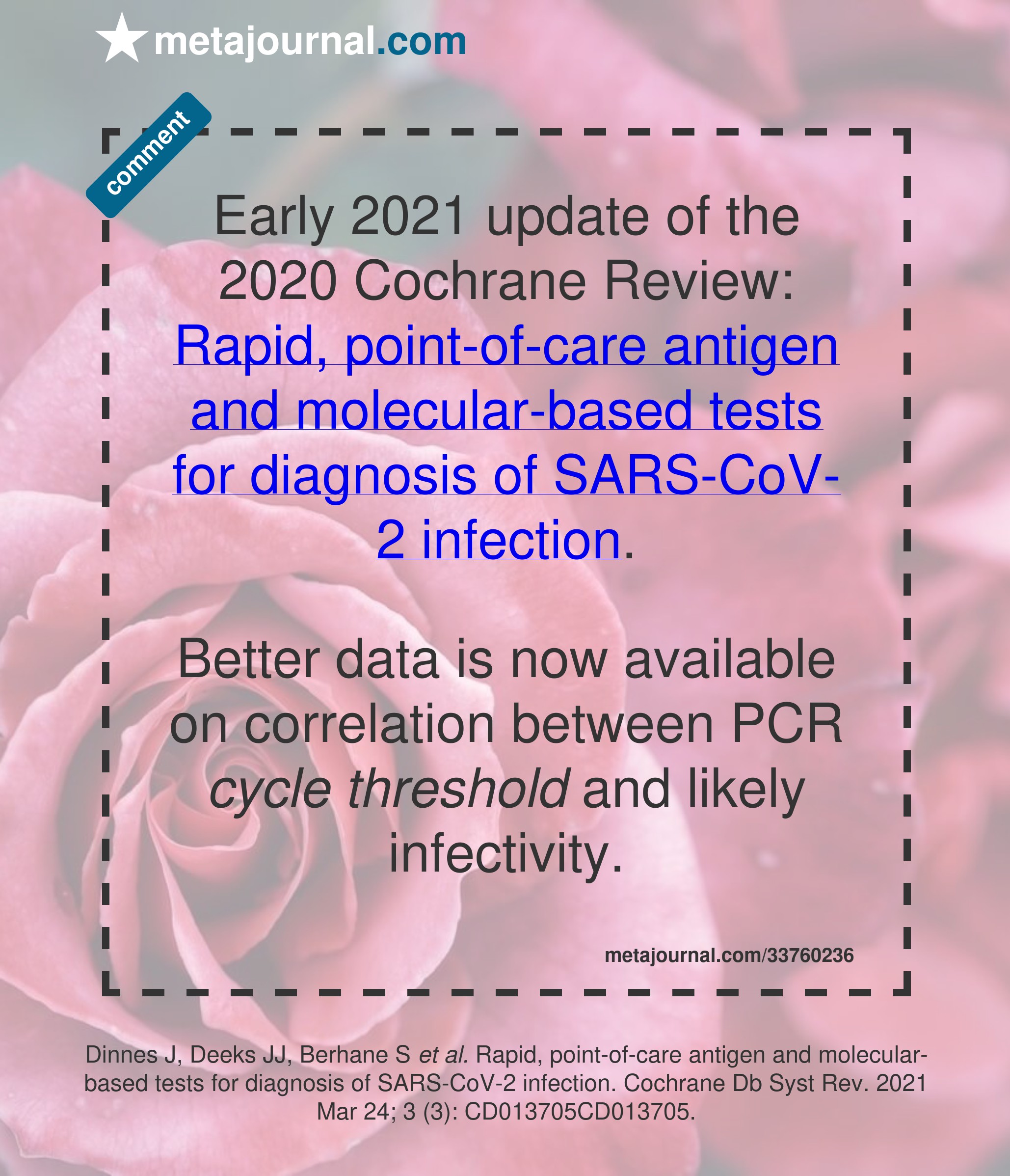 Early 2021 update of the 2020 Cochrane Review: Rapid, point-of-care antigen and molecular-based tests for diagnosis of SARS-CoV-2 infection.