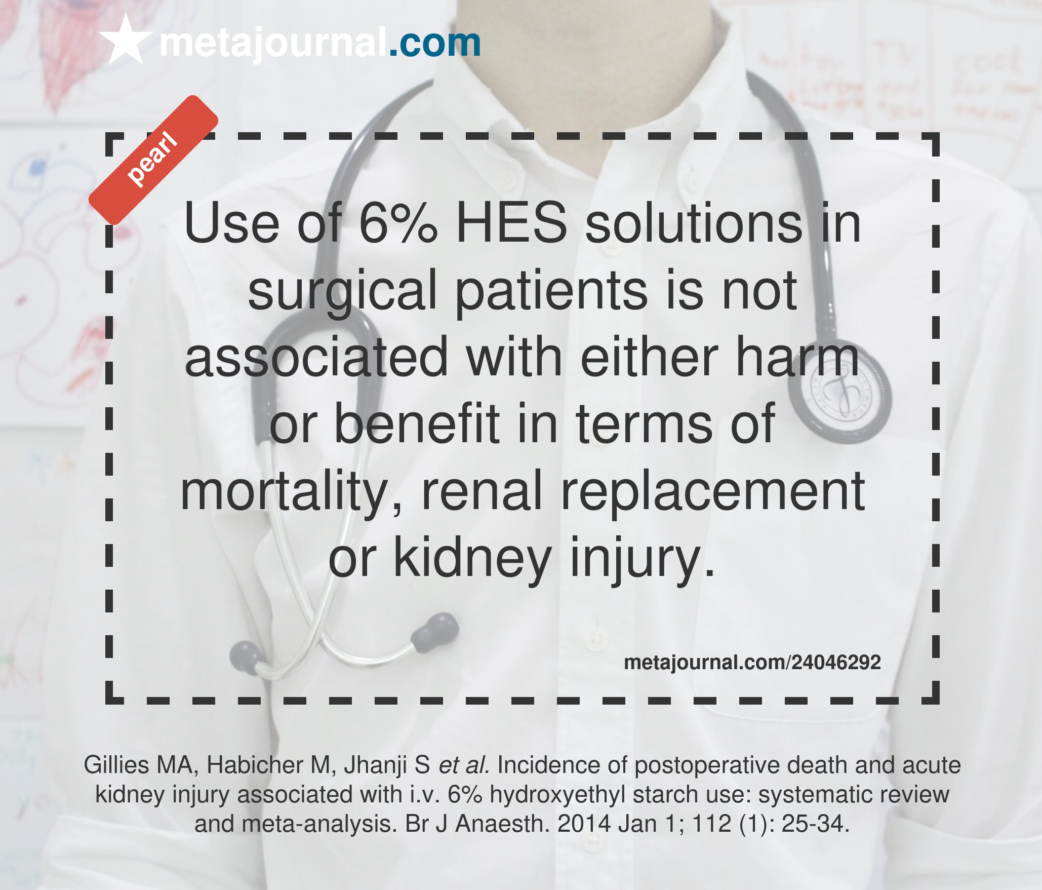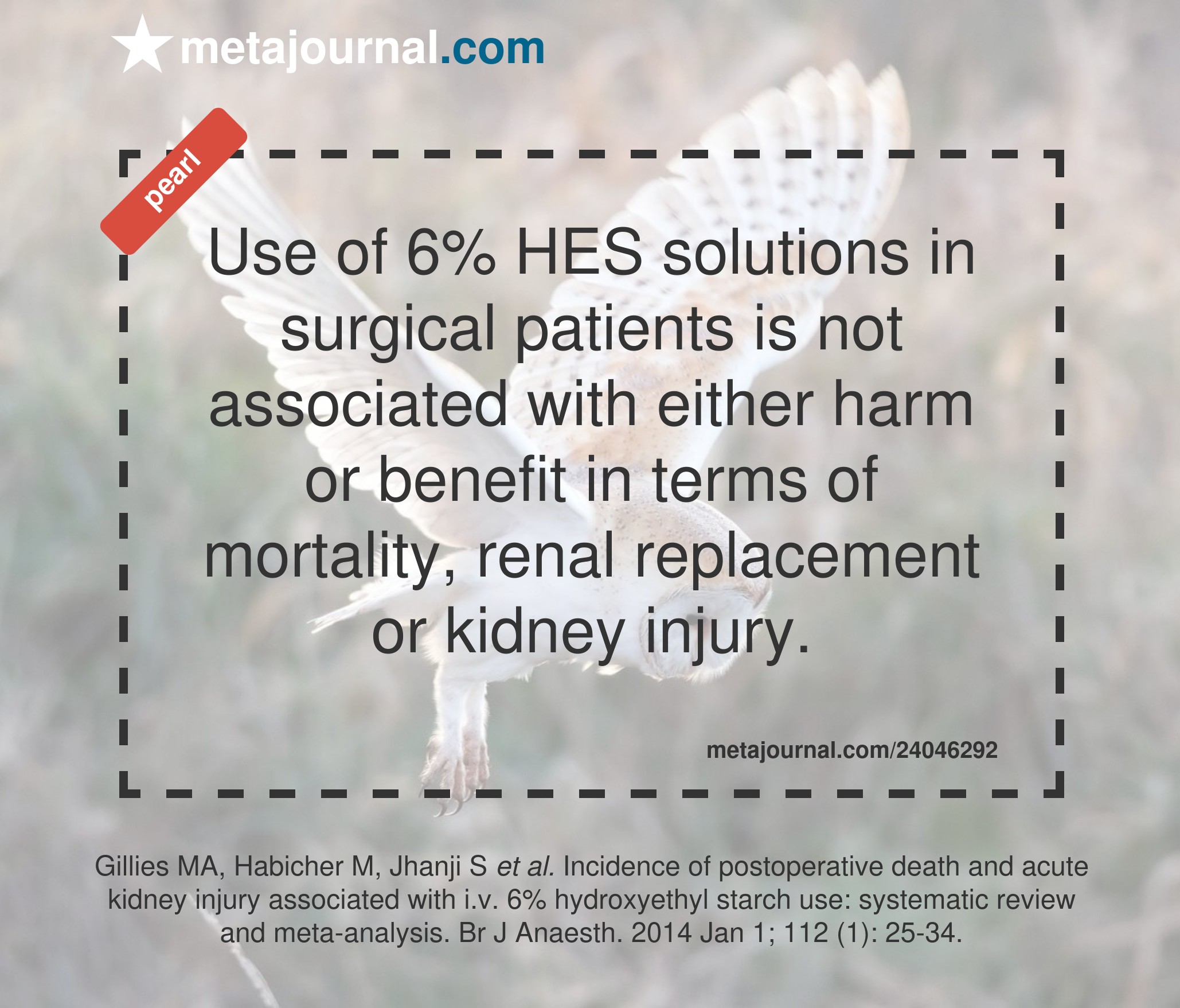 Use of 6% HES solutions in surgical patients is not associated with either harm or benefit in terms of mortality, renal replacement or kidney injury.