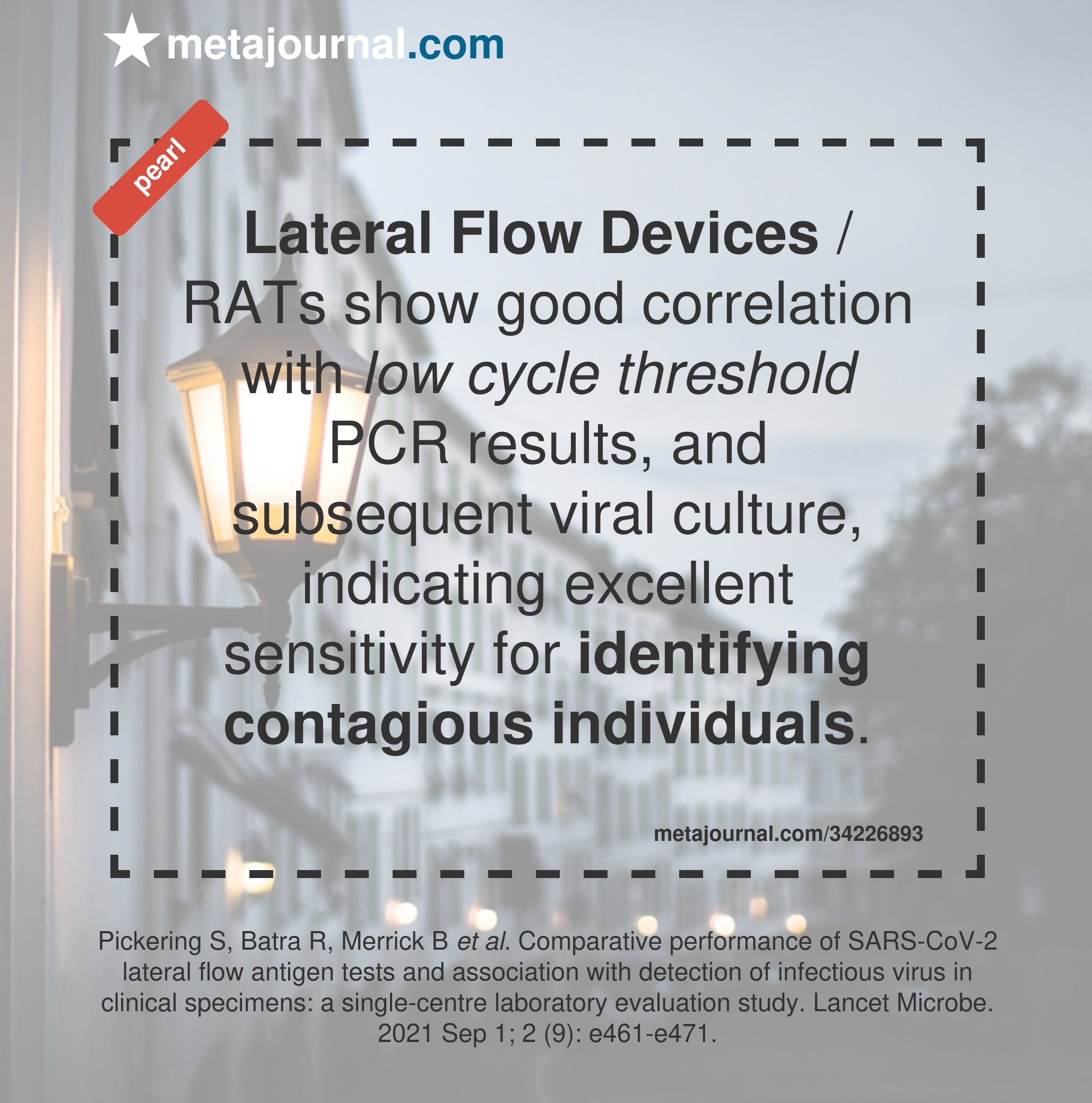 Lateral Flow Devices / RATs show good correlation with low cycle threshold PCR results, and subsequent viral culture, indicating excellent sensitivity for identifying contagious individuals.