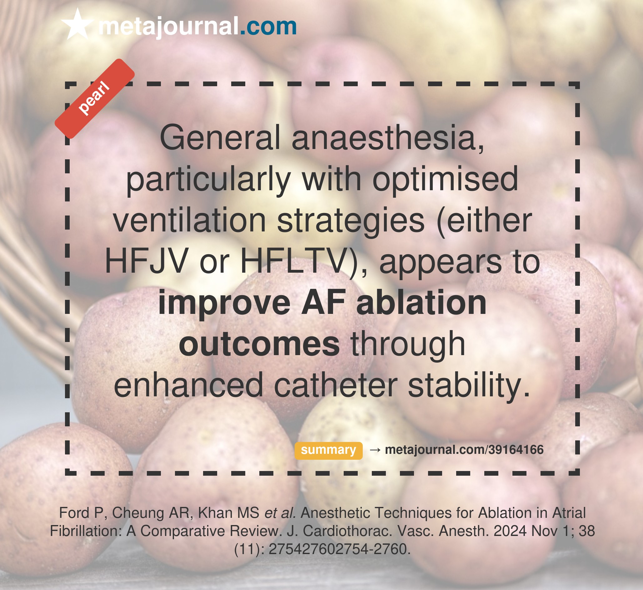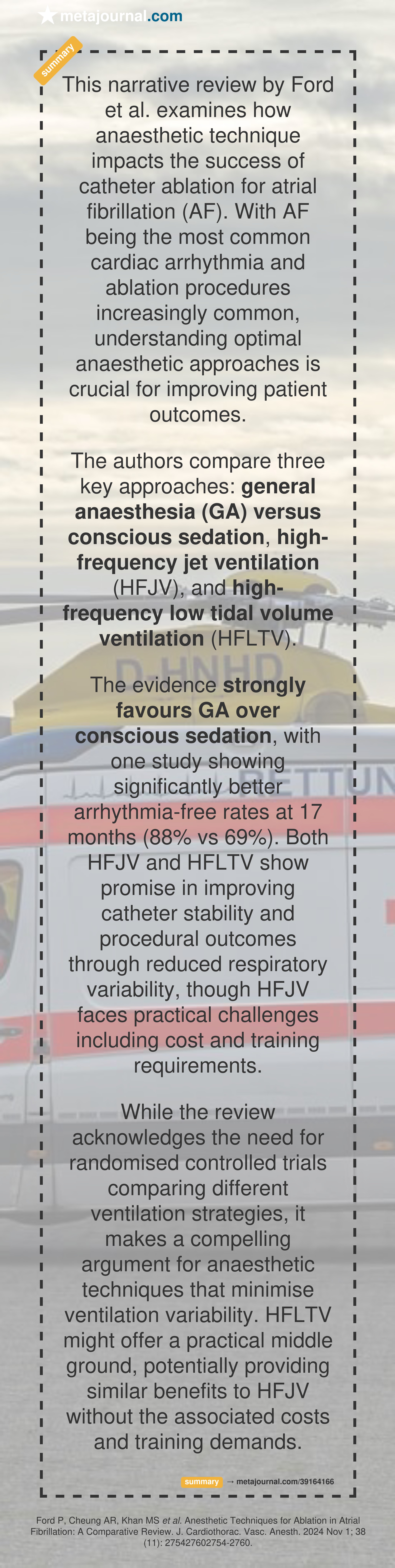 This narrative review by Ford et al. examines how anaesthetic technique impacts the success of catheter ablation for atrial fibrillation (AF). With AF being the most common cardiac arrhythmia and ablation procedures increasingly common, understanding optimal anaesthetic approaches is crucial for improving patient outcomes.