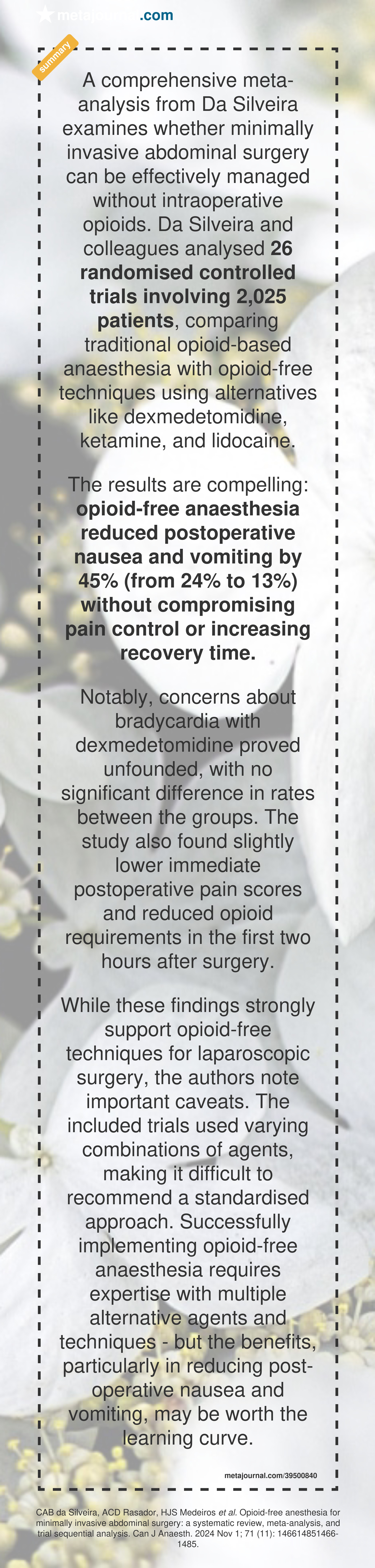 A comprehensive meta-analysis from Da Silveira examines whether minimally invasive abdominal surgery can be effectively managed without intraoperative opioids. Da Silveira and colleagues analysed 26 randomised controlled trials involving 2,025 patients, comparing traditional opioid-based anaesthesia with opioid-free techniques using alternatives like dexmedetomidine, ketamine, and lidocaine.