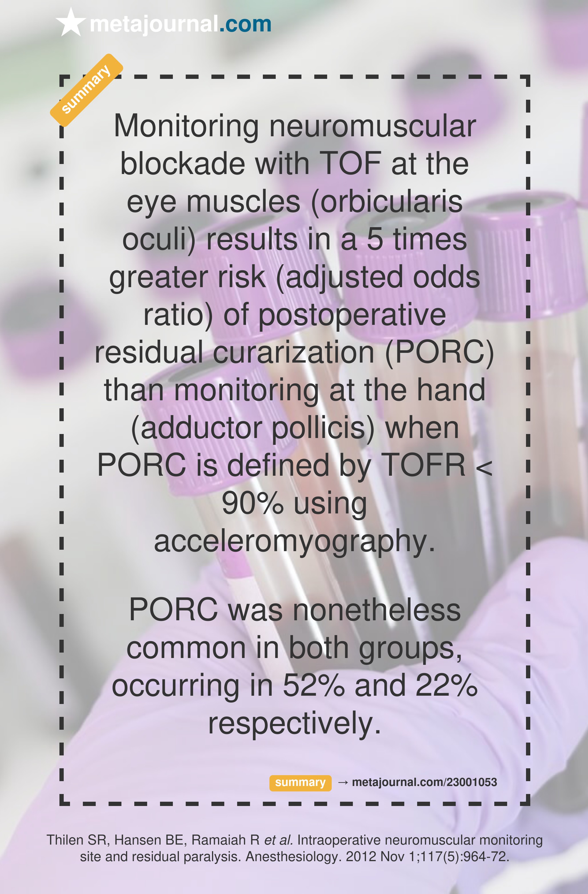 Monitoring neuromuscular blockade with TOF at the eye muscles (orbicularis oculi) results in a 5 times greater risk (adjusted odds ratio) of postoperative residual curarization (PORC) than monitoring at the hand (adductor pollicis) when PORC is defined by TOFR < 90% using acceleromyography.