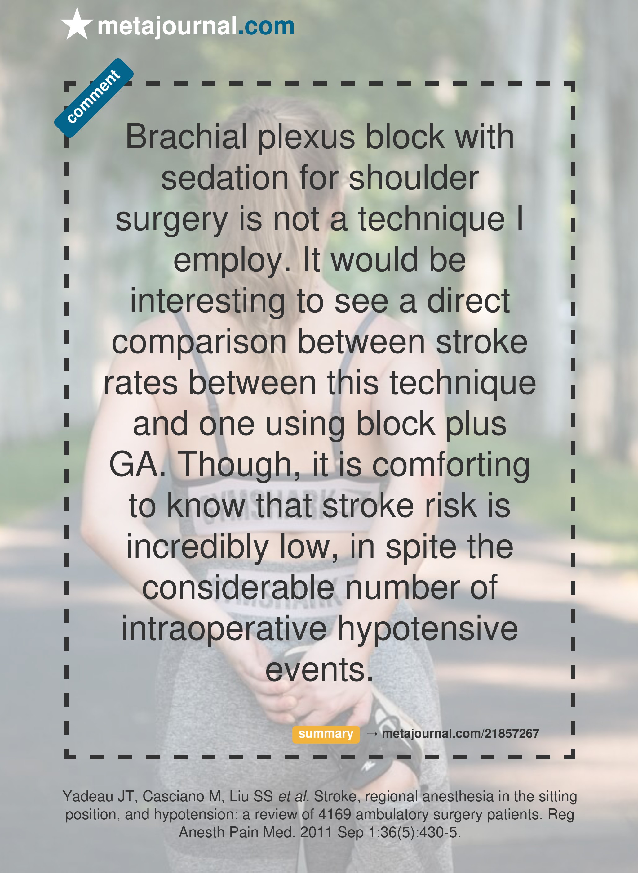 Brachial plexus block with sedation for shoulder surgery is not a technique I employ. It would be interesting to see a direct comparison between stroke rates between this technique and one using block plus GA. Though, it is comforting to know that stroke risk is incredibly low, in spite the considerable number of intraoperative hypotensive events.