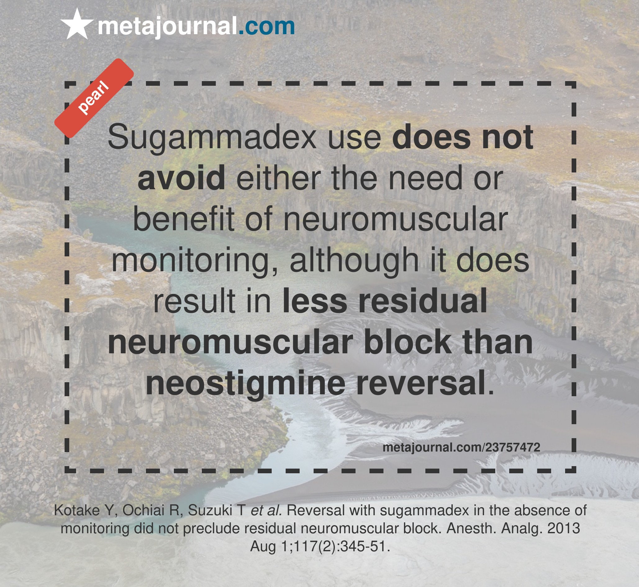 Sugammadex use does not avoid either the need or benefit of neuromuscular monitoring, although it does result in less residual neuromuscular block than neostigmine reversal.