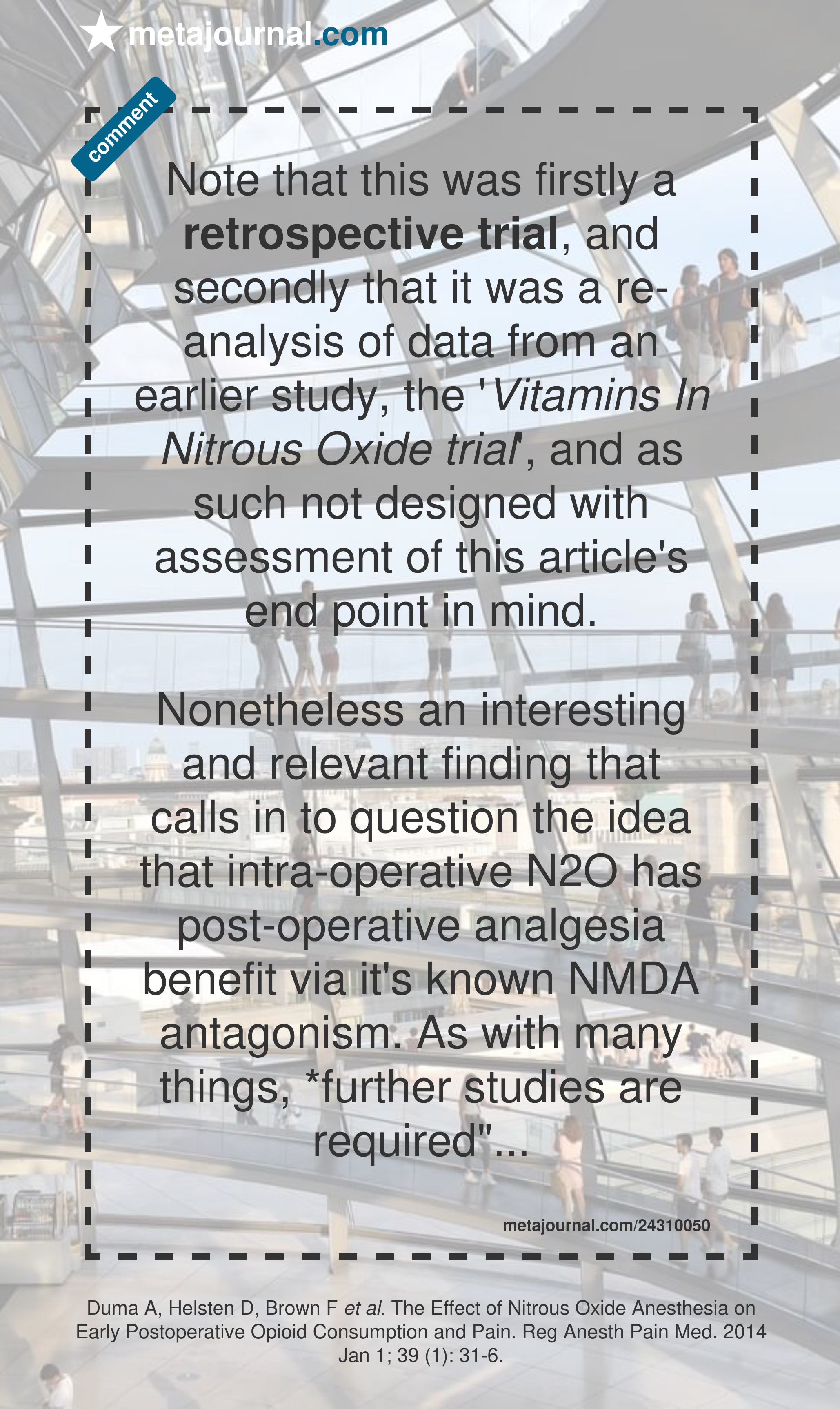 Nonetheless an interesting and relevant finding that calls in to question the idea that intra-operative N2O has post-operative analgesia benefit via it's known NMDA antagonism. As with many things, *further studies are required"...