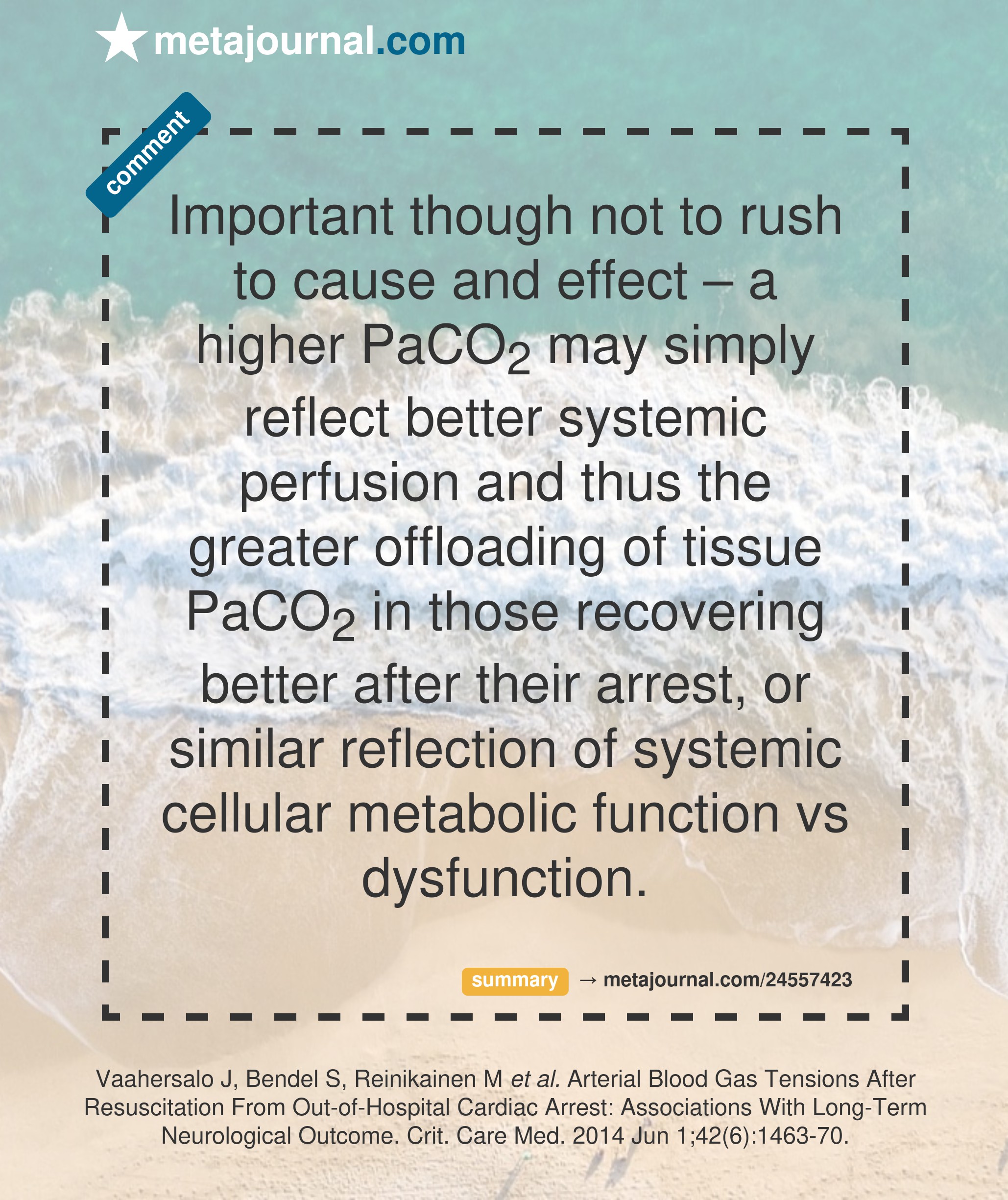 ObjectivesOptimal oxygen and carbon dioxide levels during postcardiac arrest care are currently undefined and observational studies have suggested harm from hyperoxia exposure. We aimed to assess whether mean and time-weighted oxygen and carbon dioxide levels during the first 24 hours of postcardiac arrest care correlate with 12-month neurologic outcome.DesignProspective observational cohort study.SettingTwenty-one ICUs in Finland.PatientsOut-of-hospital cardiac arrest patients treated in ICUs in Finland between March 2010 and February 2011.InterventionsNone.Measurements And Main ResultsArterial blood PaO2 and PaCO2 during the first 24 hours from admission were divided into predefined categories from the lowest to the highest. Proportions of time spent in different categories and the mean PaO2 and PaCO2 values during the first 24 hours were included in separate multivariable regression models along with resuscitation factors. The cerebral performance category at 12 months was used as primary endpoint. A total of 409 patients with arterial blood gases analyzed at least once and with a complete set of resuscitation data were included. The average amount of PaO2 and PaCO2 measurements was eight per patient. The mean 24 hours PaCO2 level was an independent predictor of good outcome (odds ratio, 1.054; 95% CI, 1.006-1.104; p = 0.027) but the mean PaO2 value was not (odds ratio, 1.006; 95% CI, 0.998-1.014; p = 0.149). With multivariate regression analysis, time spent in the PaCO2 band higher than 45 mm Hg was associated with good outcome (odds ratio, 1.015; 95% CI, 1.002-1.029; p = 0.024, for each percentage point increase in time) but time spent in different oxygen categories were not.ConclusionsIn this multicenter study, hypercapnia was associated with good 12-month outcome in patients resuscitated from out-of-hospital cardiac arrest. We were unable to verify any harm from hyperoxia exposure. Further trials should focus on whether moderate hypercapnia during postcardiac arrest care improves outcome.