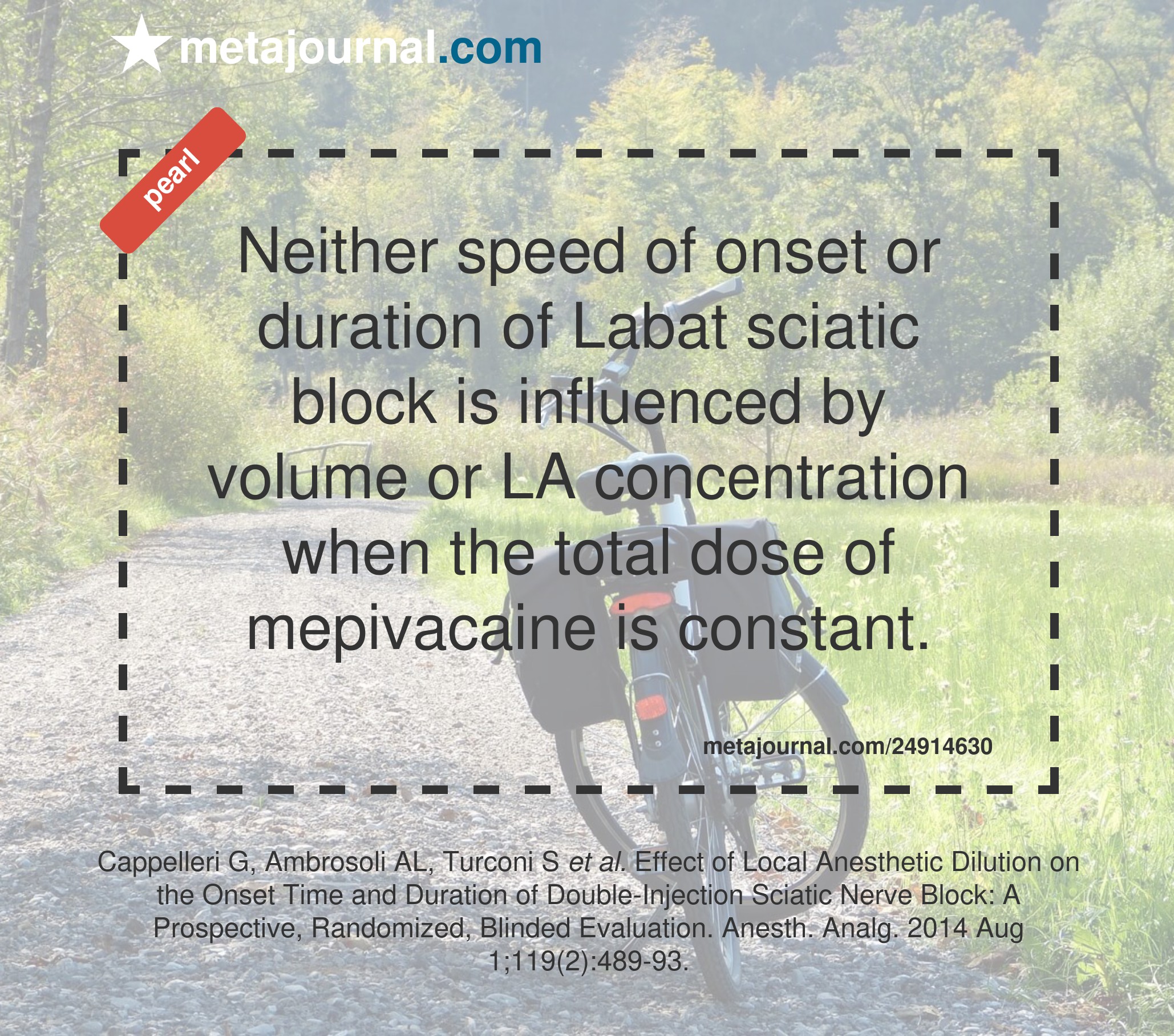 Neither speed of onset or duration of Labat sciatic block is influenced by volume or LA concentration when the total dose of mepivacaine is constant.