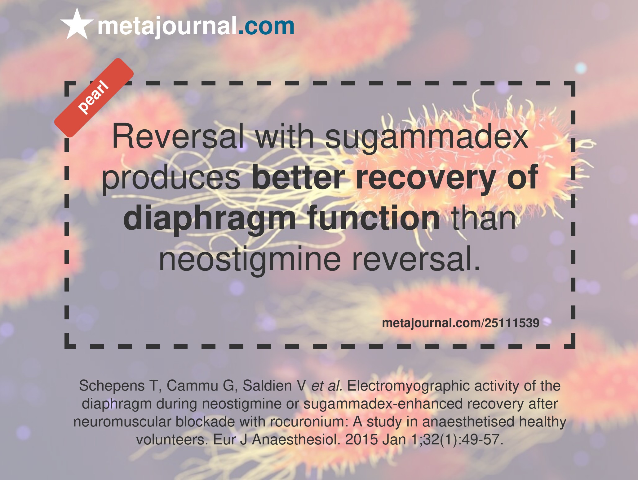 Electromyographic activity of the diaphragm during neostigmine or sugammadex-enhanced recovery after neuromuscular blockade with rocuronium: A study in anaesthetised healthy volunteers.