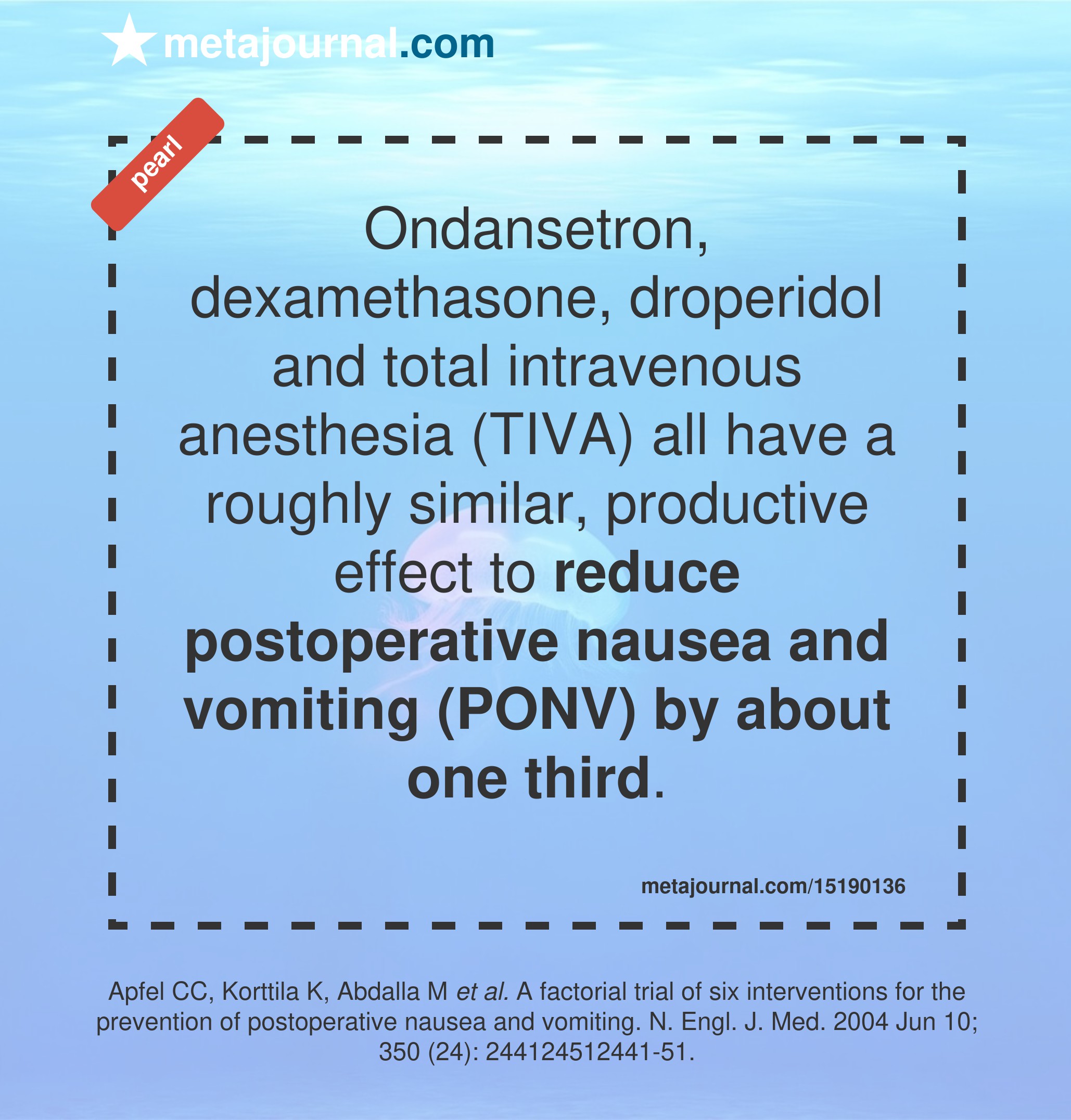 Ondansetron, dexamethasone, droperidol and total intravenous anesthesia (TIVA) all have a roughly similar, productive effect to reduce postoperative nausea and vomiting (PONV) by about one third.