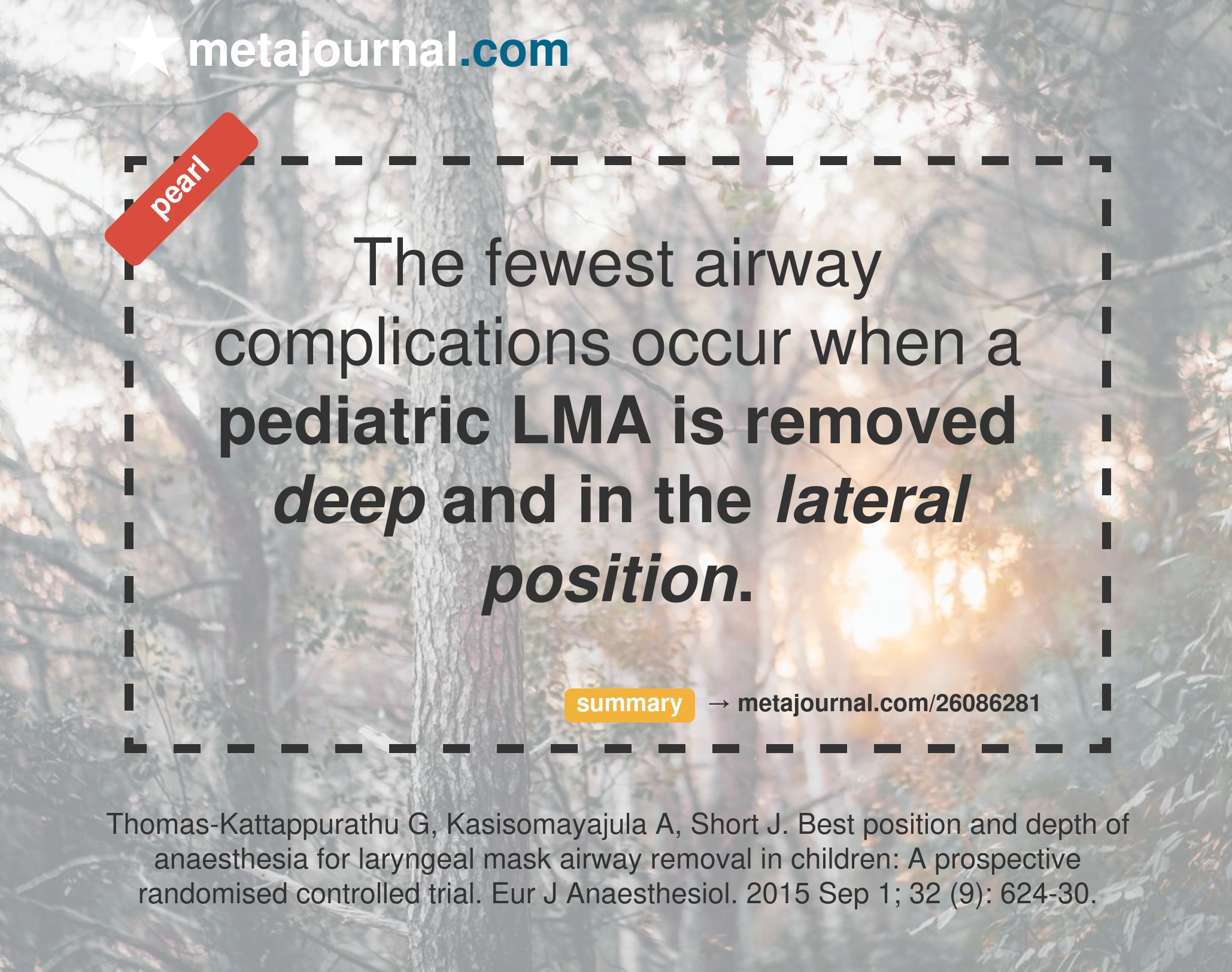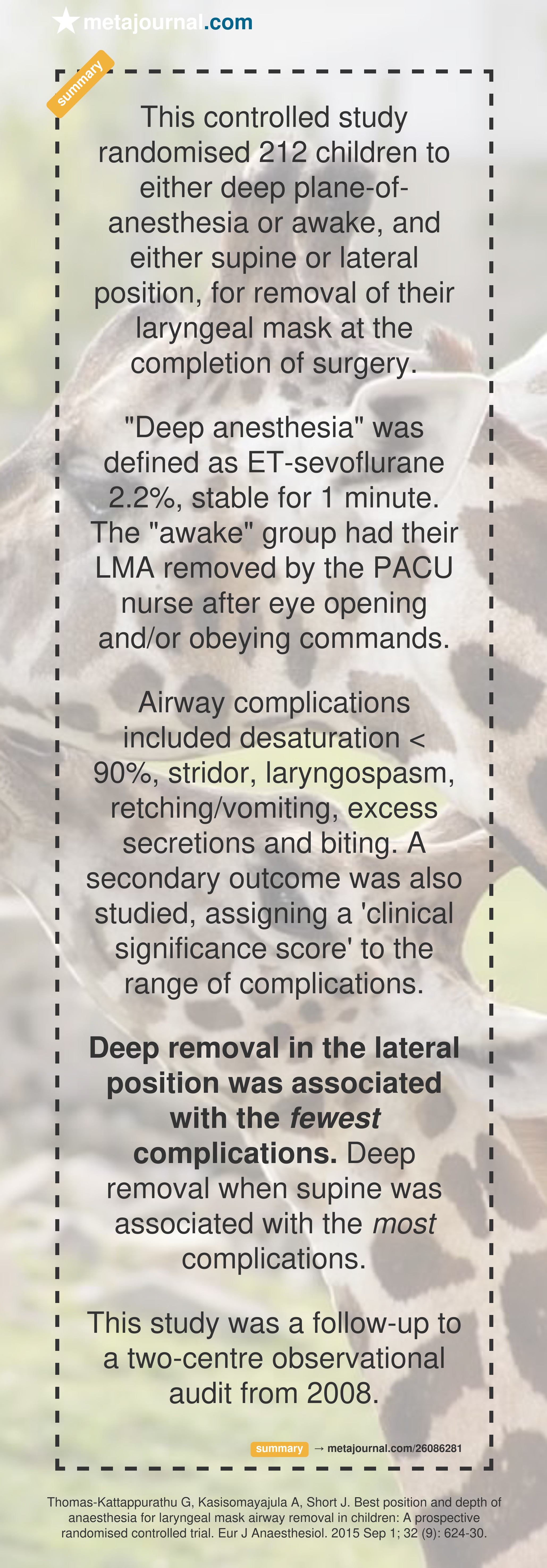 This controlled study randomised 212 children to either deep plane-of-anesthesia or awake, and either supine or lateral position, for removal of their laryngeal mask at the completion of surgery.