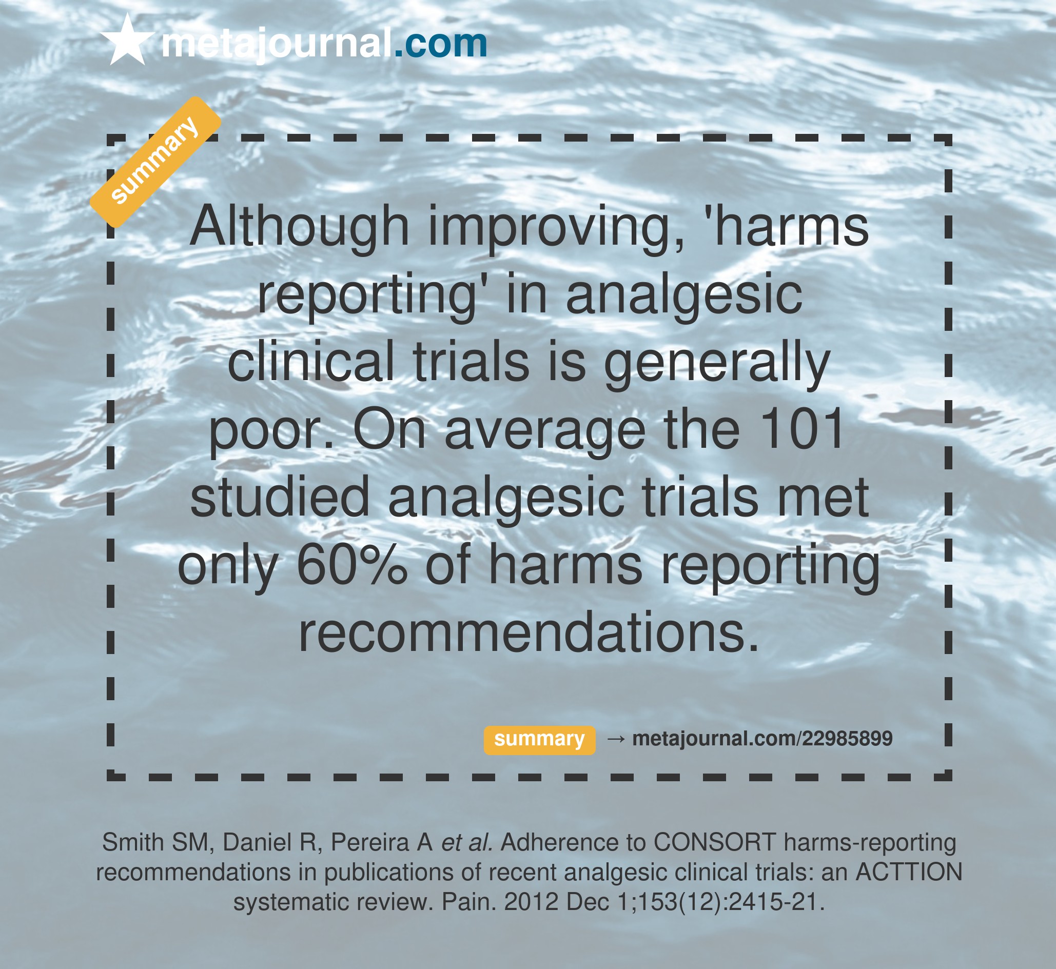 Although improving, 'harms reporting' in analgesic clinical trials is generally poor. On average the 101 studied analgesic trials met only 60% of harms reporting recommendations.