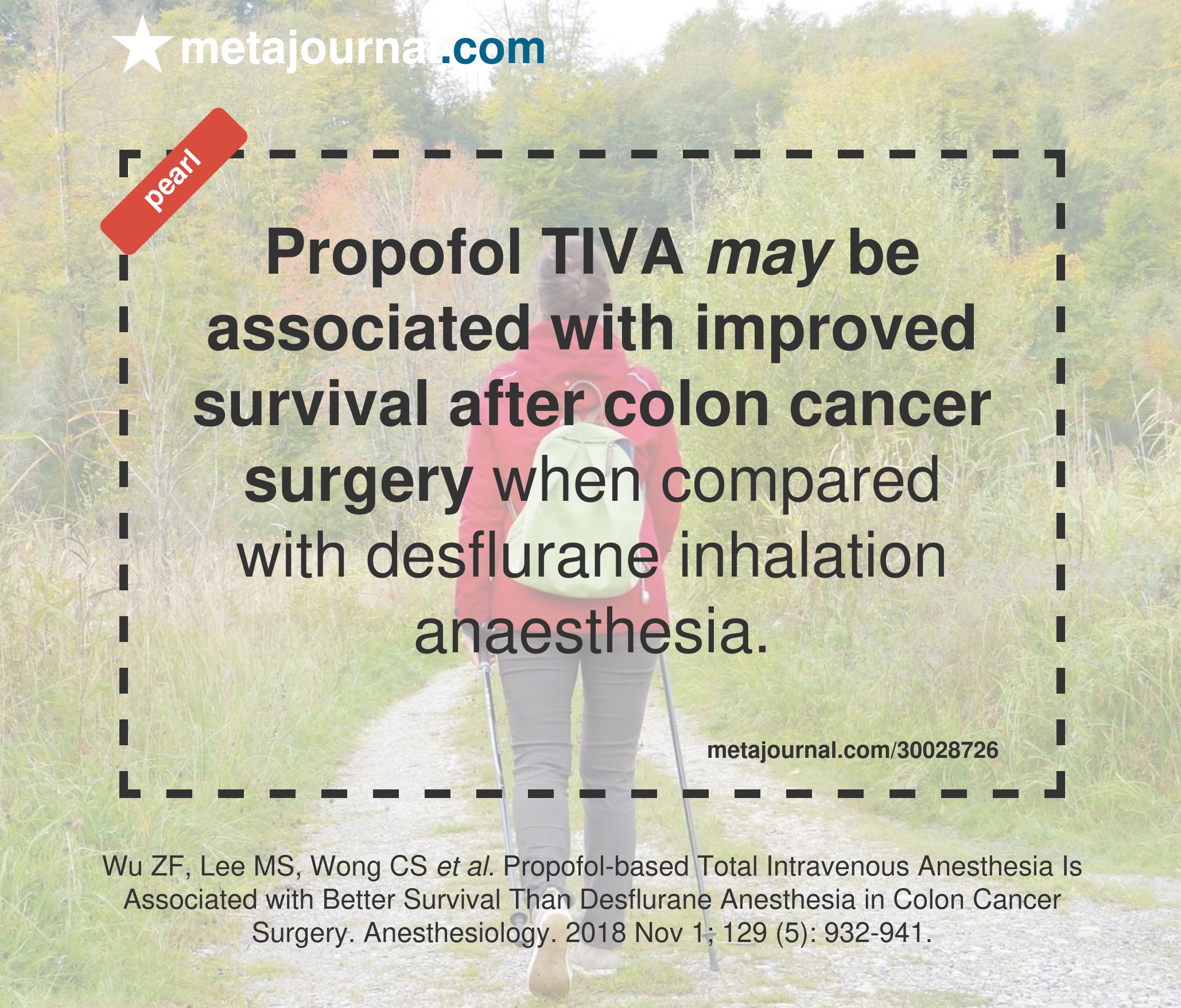 Propofol TIVA may be associated with improved survival after colon cancer surgery when compared with desflurane inhalation anaesthesia.
