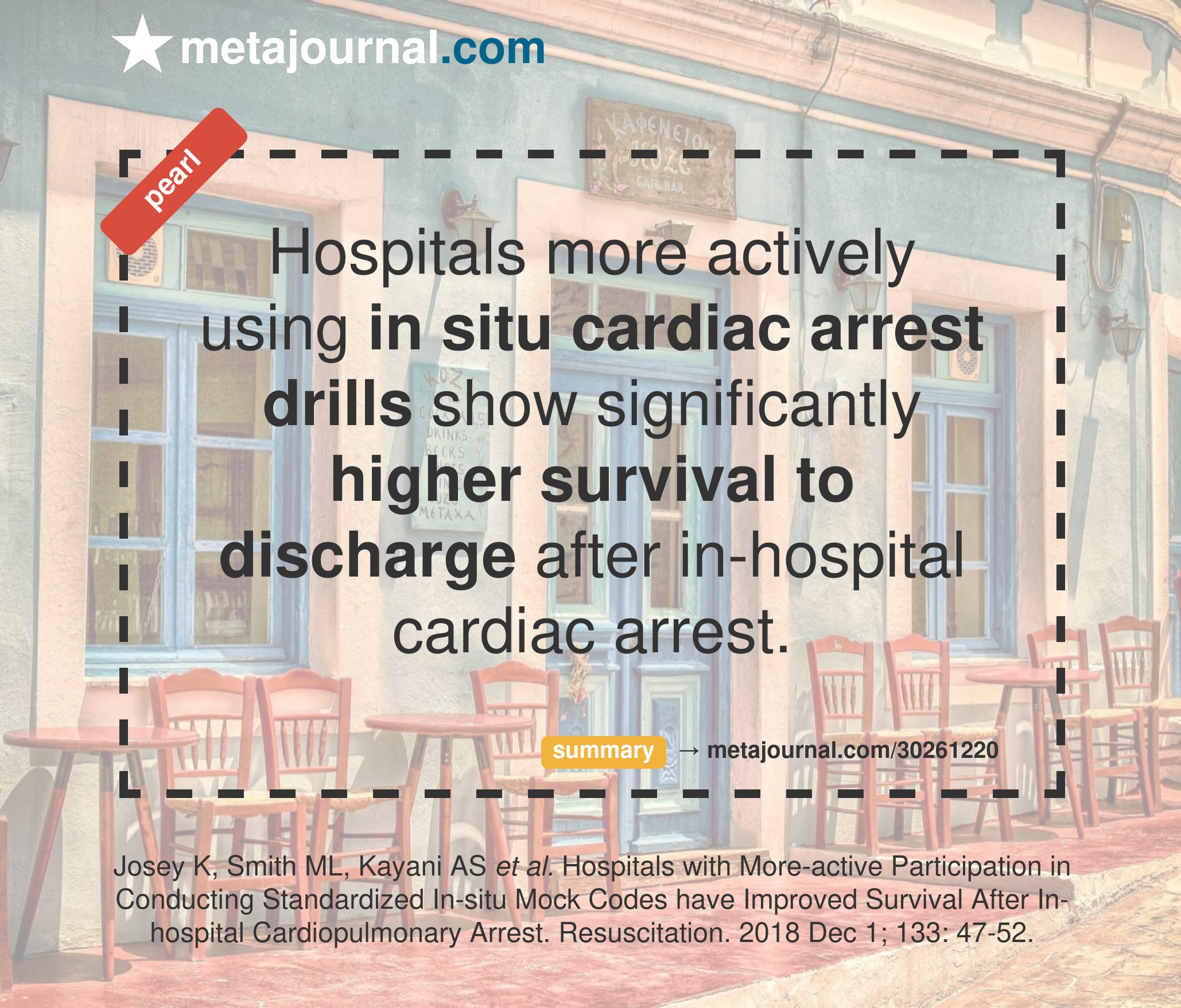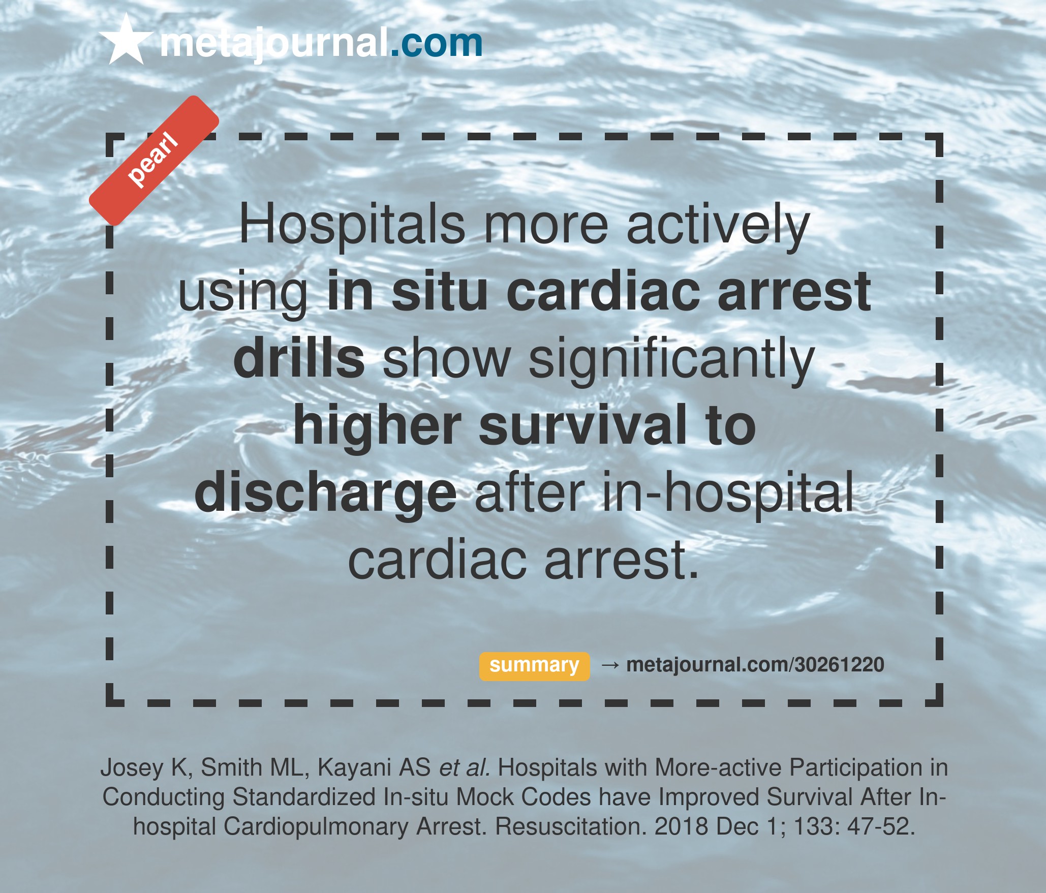 Josey and team set out to identify whether greater hospital use of in-situ AHCI drills (‘in-situ mock codes’ - ISMC) was associated with improved IHCA survival. They measured both hospital-level simulation participation and IHCA discharge survival rates across 26 hospitals in their US multi-state non-profit health system.
