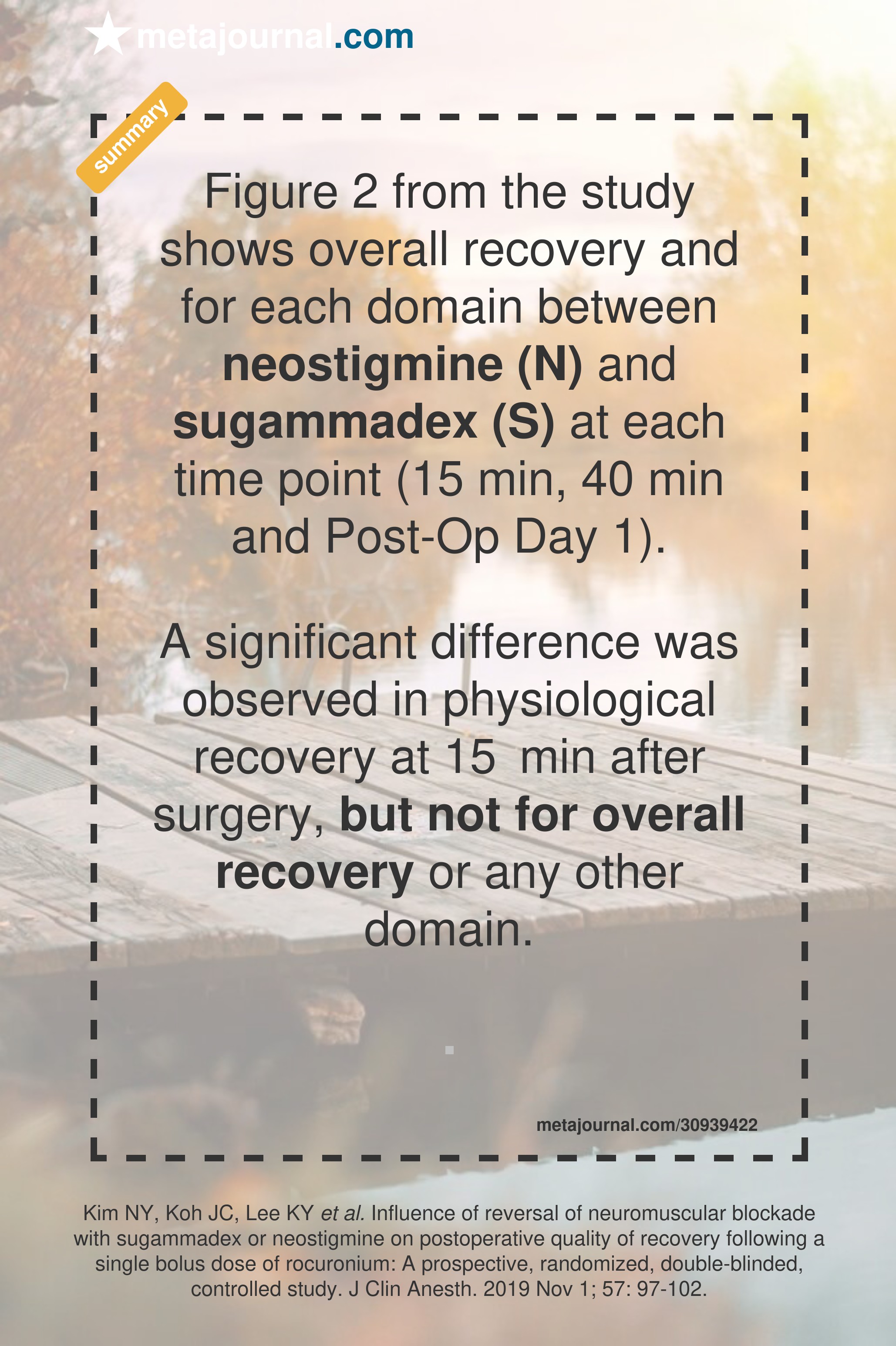 Figure 2 from the study shows overall recovery and for each domain between neostigmine (N) and sugammadex (S) at each time point (15 min, 40 min and Post-Op Day 1).
