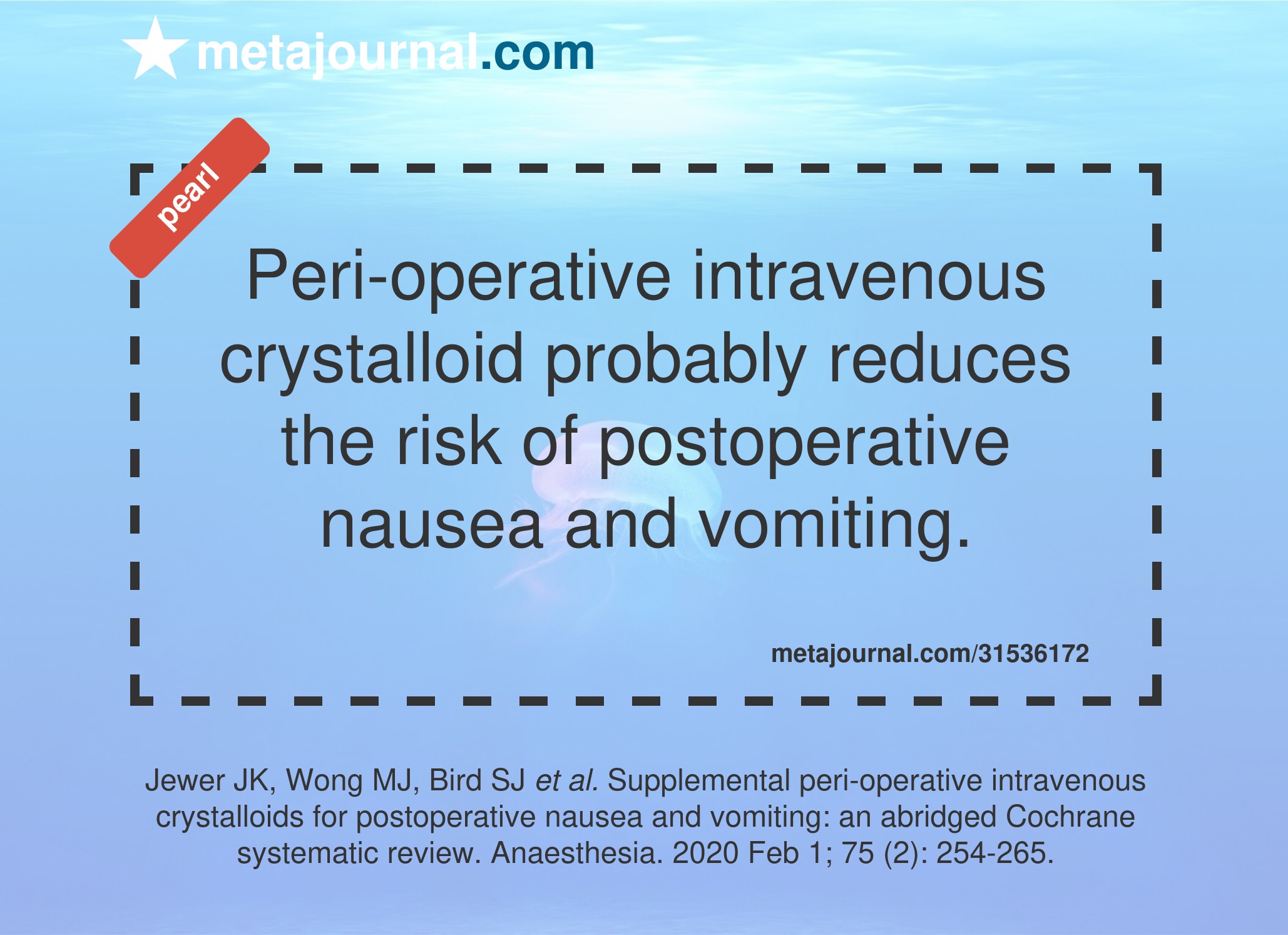 AbstractWe conducted a Cochrane systematic review on the effectiveness of supplemental intravenous crystalloid administration in preventing postoperative nausea and vomiting. We included randomised controlled trials of patients undergoing surgery under general anaesthesia and given supplemental peri-operative intravenous crystalloid. Our primary outcomes were the risk of postoperative nausea and the risk of postoperative vomiting. We assessed the risk of bias for each included study and applied the Grading of Recommendations, Assessment, Development and Evaluations (GRADE) framework for the certainty of evidence. We included 41 studies. We found that the intervention probably reduces the overall risk of postoperative nausea, the risk ratio (95%CI) being 0.62 (0.51-0.75) (I2 = 57%, p < 0.00001, 18 studies; 1766 participants; moderate-certainty evidence). It also probably reduces the risk of postoperative nausea within 6 h of surgery, with a risk ratio (95%CI) of 0.67 (0.58 to 0.78) (I2 = 9%, p < 0.00001, 20 studies; 2310 participants; moderate-certainty evidence) and by around 24 h, the risk ratio (95%CI) being 0.47 (0.32-0.69) (I2 = 38%, p = 0.0001, 17 studies; 1682 participants; moderate-certainty evidence). Supplemental intravenous crystalloid probably also reduces the overall risk of postoperative vomiting, with a risk ratio (95%CI) of 0.50 (0.40-0.63) (I2 = 31%, p < 0.00001, 20 studies; 1970 participants; moderate-certainty evidence). The beneficial effect on vomiting was seen both within 6 h and by around 24 h postoperatively.© 2019 Association of Anaesthetists.