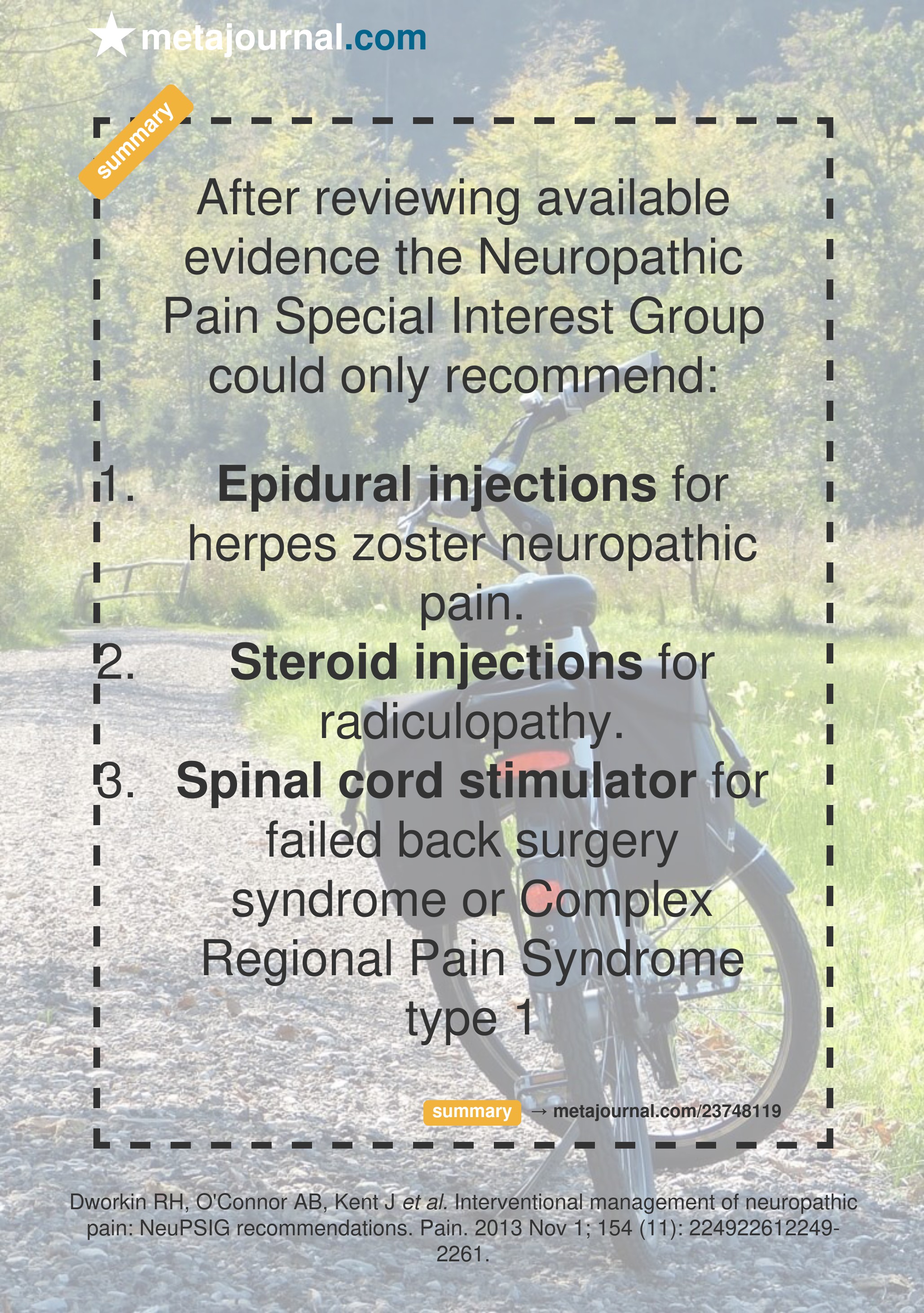AbstractNeuropathic pain (NP) is often refractory to pharmacologic and noninterventional treatment. On behalf of the International Association for the Study of Pain Neuropathic Pain Special Interest Group, the authors evaluated systematic reviews, clinical trials, and existing guidelines for the interventional management of NP. Evidence is summarized and presented for neural blockade, spinal cord stimulation (SCS), intrathecal medication, and neurosurgical interventions in patients with the following peripheral and central NP conditions: herpes zoster and postherpetic neuralgia (PHN); painful diabetic and other peripheral neuropathies; spinal cord injury NP; central poststroke pain; radiculopathy and failed back surgery syndrome (FBSS); complex regional pain syndrome (CRPS); and trigeminal neuralgia and neuropathy. Due to the paucity of high-quality clinical trials, no strong recommendations can be made. Four weak recommendations based on the amount and consistency of evidence, including degree of efficacy and safety, are: 1) epidural injections for herpes zoster; 2) steroid injections for radiculopathy; 3) SCS for FBSS; and 4) SCS for CRPS type 1. Based on the available data, we recommend not to use sympathetic blocks for PHN nor radiofrequency lesions for radiculopathy. No other conclusive recommendations can be made due to the poor quality of available data. Whenever possible, these interventions should either be part of randomized clinical trials or documented in pain registries. Priorities for future research include randomized clinical trials, long-term studies, and head-to-head comparisons among different interventional and noninterventional treatments.Copyright © 2013 International Association for the Study of Pain. Published by Elsevier B.V. All rights reserved.