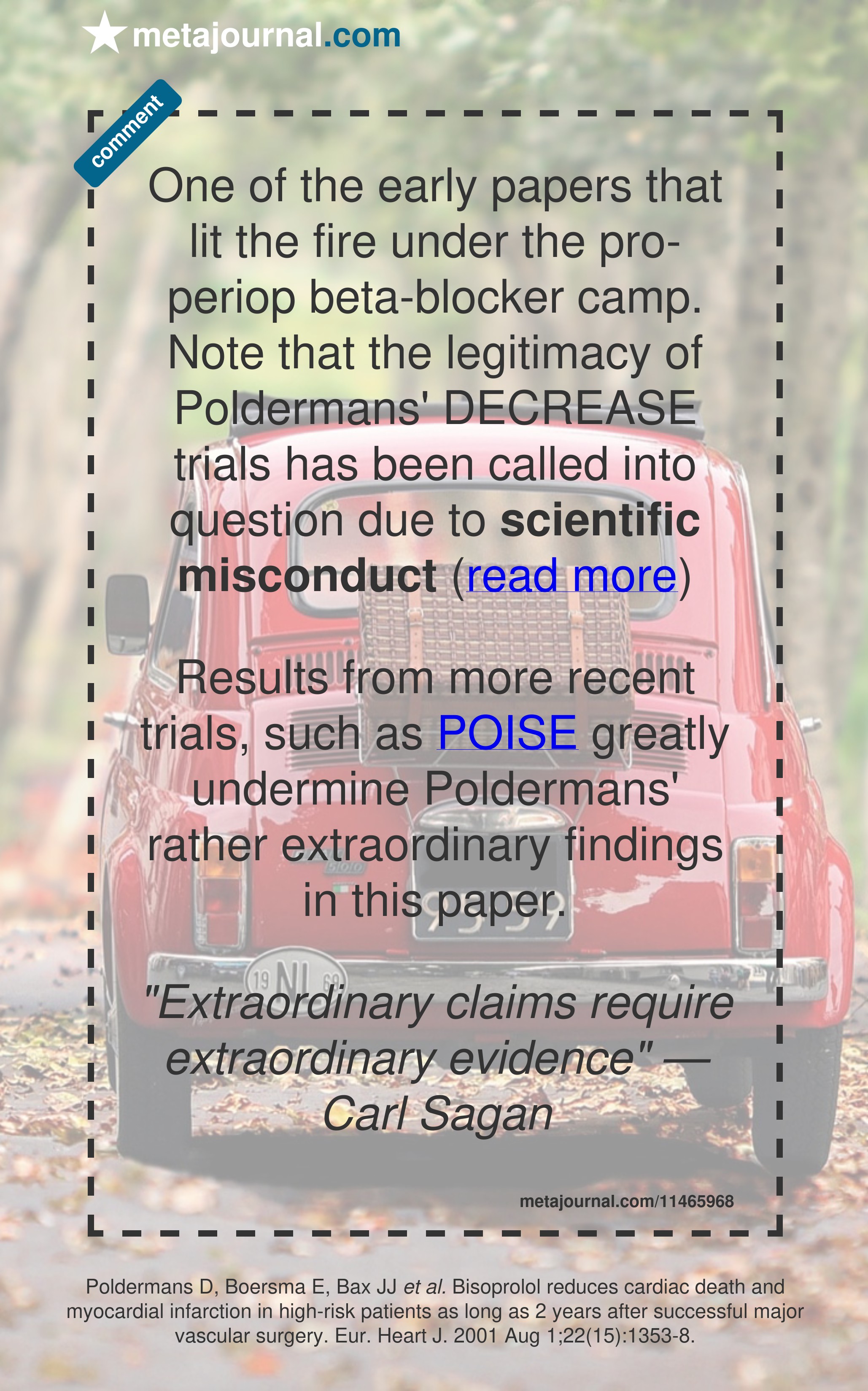 One of the early papers that lit the fire under the pro-periop beta-blocker camp. Note that the legitimacy of Poldermans' DECREASE trials has been called into question due to scientific misconduct (read more)