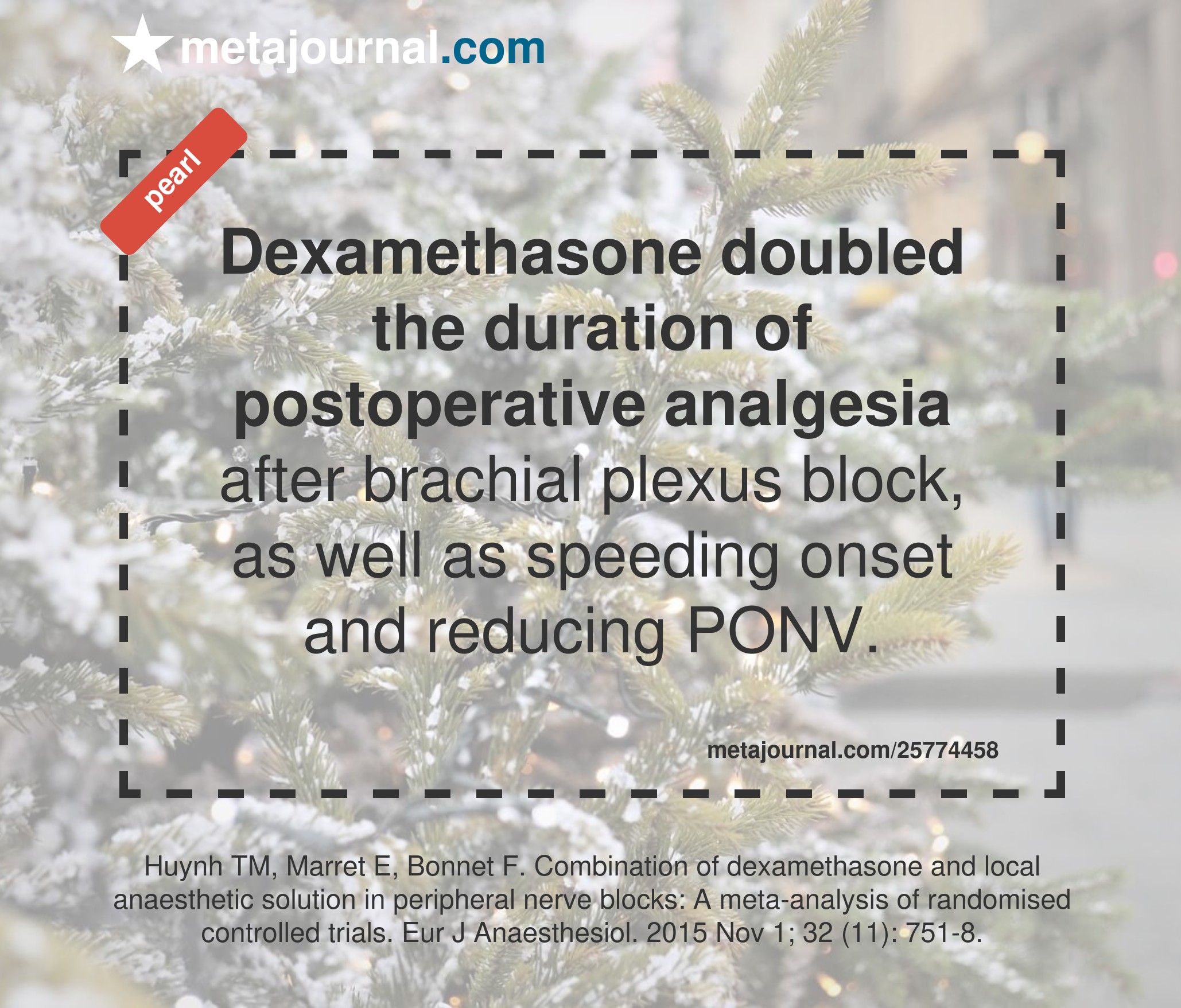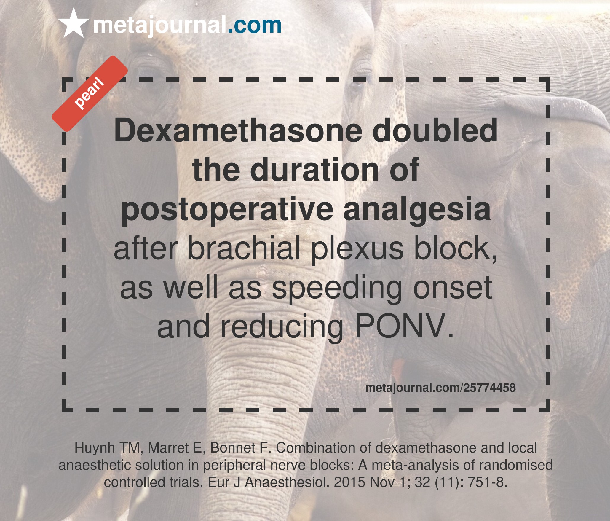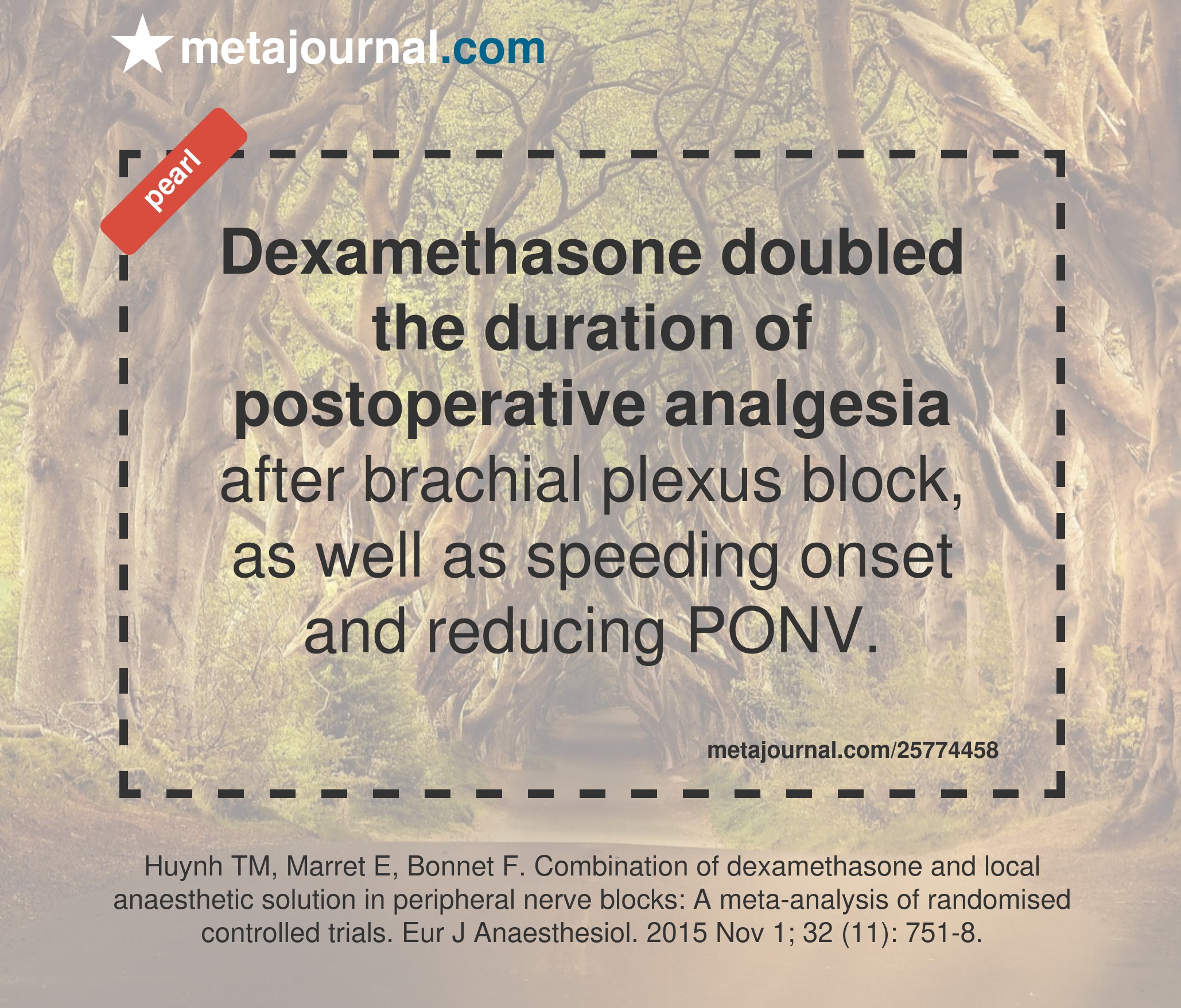 The potential for dexamethasone and other glucocorticoids to prolong peripheral nerve blocks was first noted almost 20 years ago.