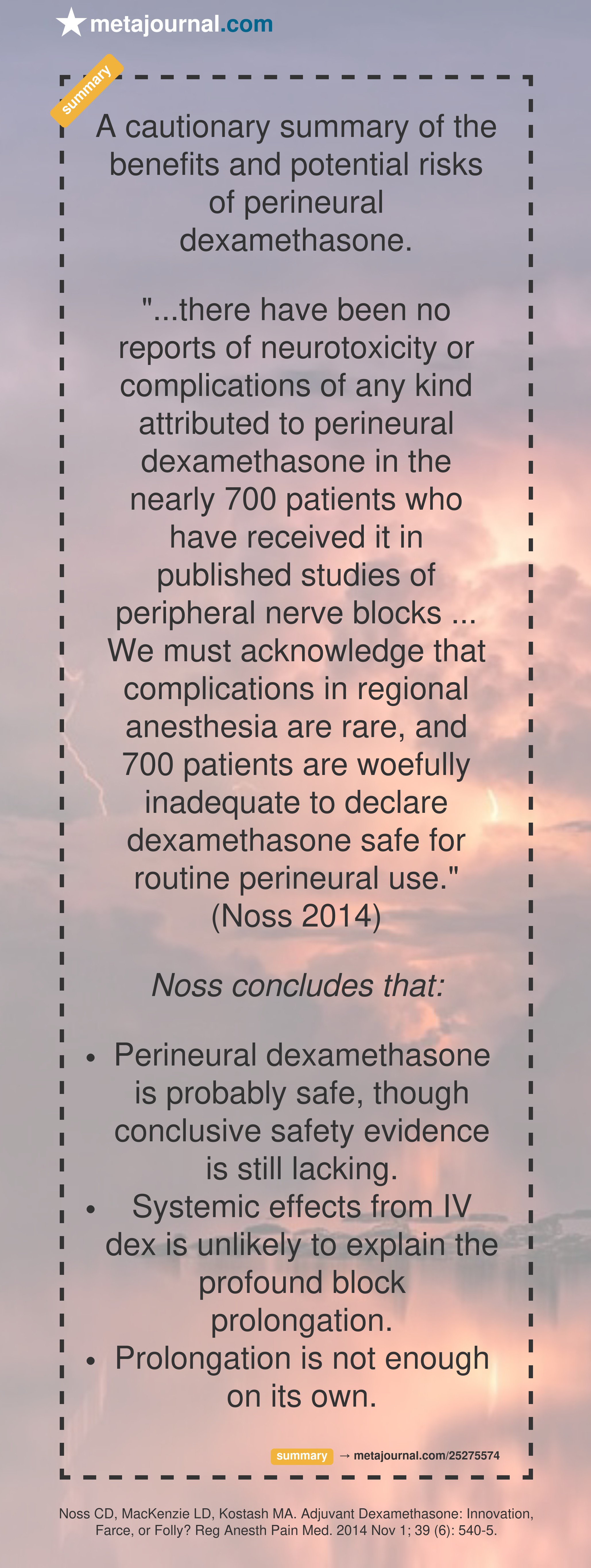 "...there have been no reports of neurotoxicity or complications of any kind attributed to perineural dexamethasone in the nearly 700 patients who have received it in published studies of peripheral nerve blocks ... We must acknowledge that complications in regional anesthesia are rare, and 700 patients are woefully inadequate to declare dexamethasone safe for routine perineural use." (Noss 2014)