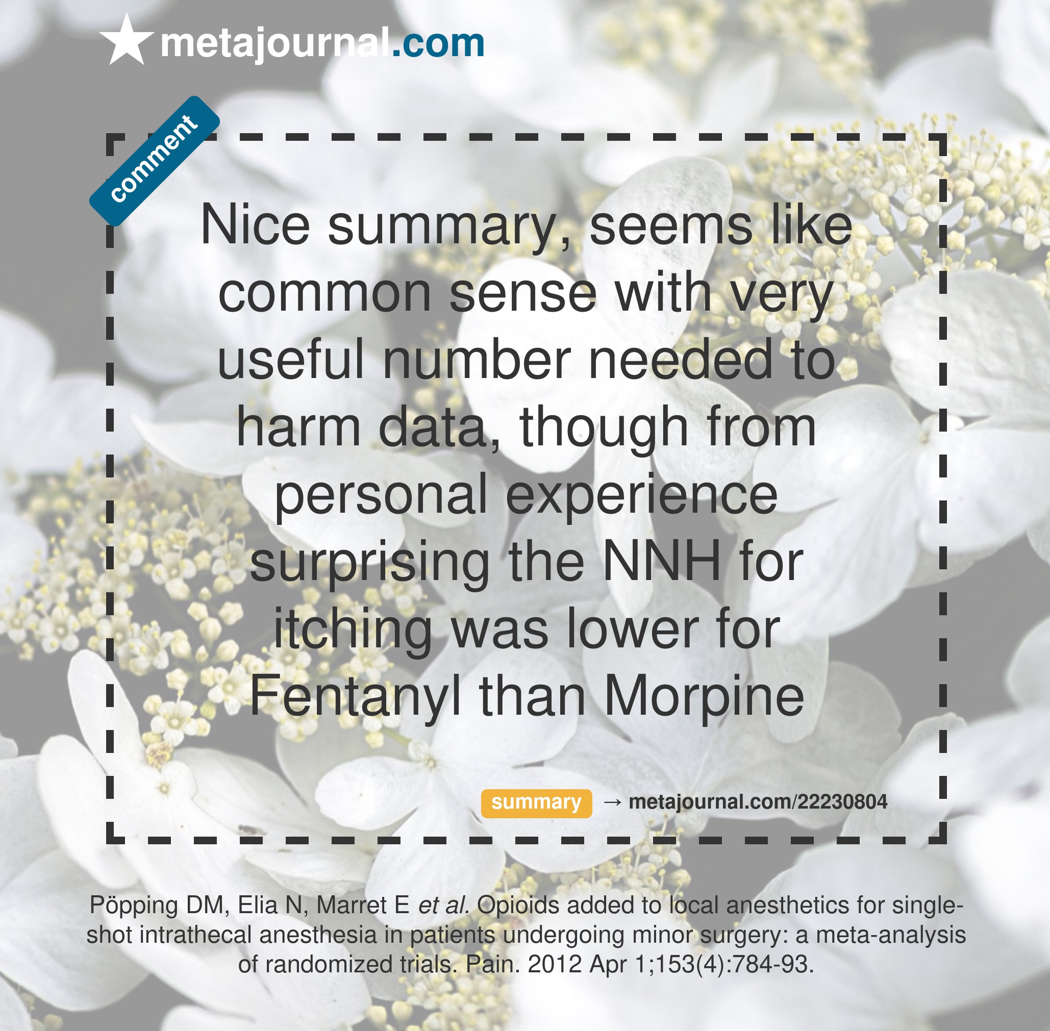 Nice summary, seems like common sense with very useful number needed to harm data, though from personal experience surprising the NNH for itching was lower for Fentanyl than Morpine