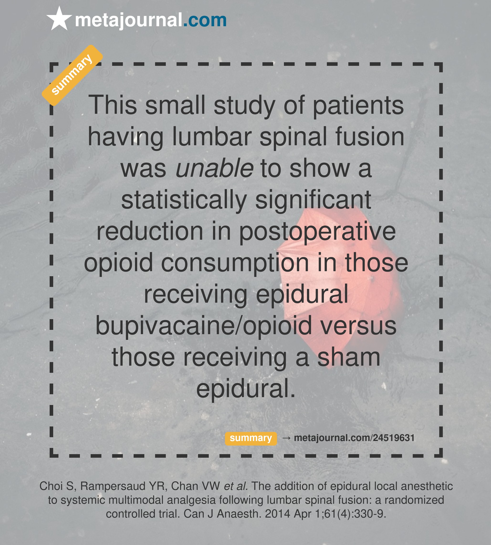 This small study of patients having lumbar spinal fusion was unable to show a statistically significant reduction in postoperative opioid consumption in those receiving epidural bupivacaine/opioid versus those receiving a sham epidural.