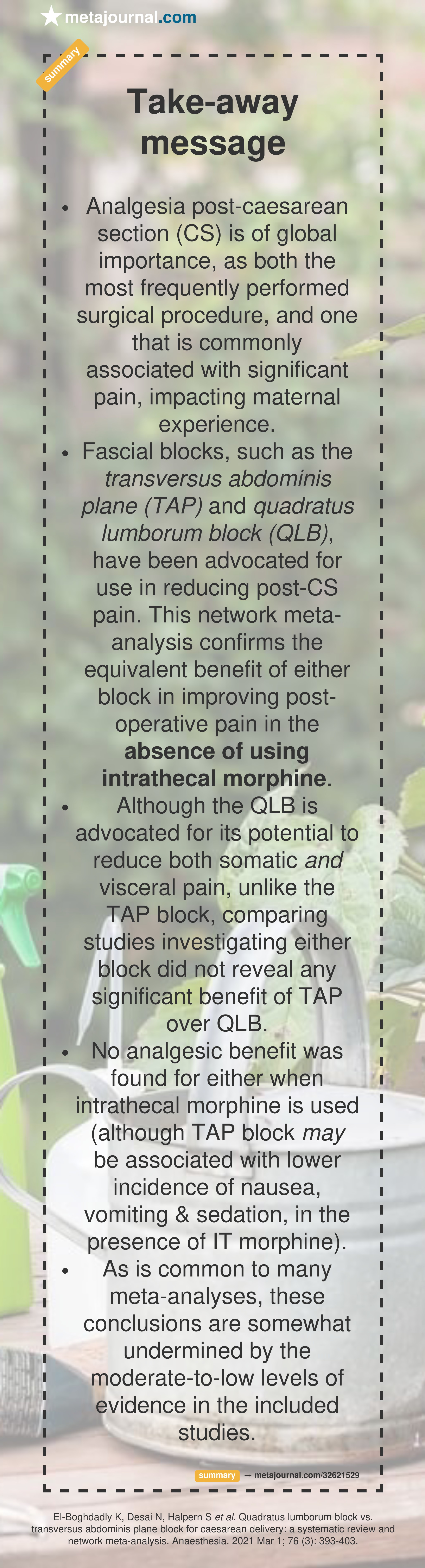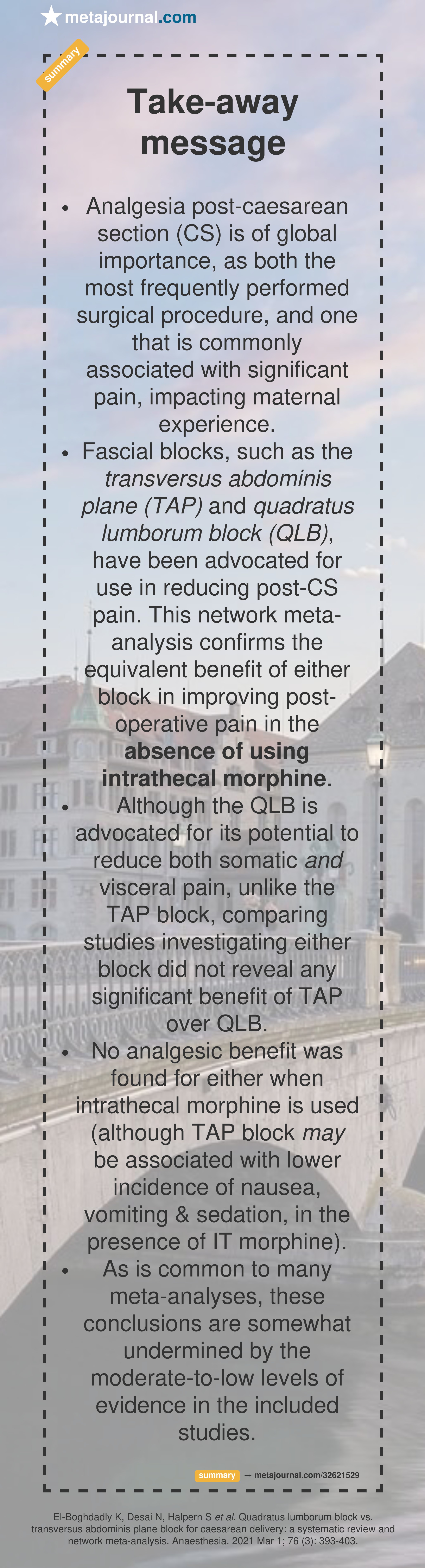 - Fascial blocks, such as the transversus abdominis plane (TAP) and quadratus lumborum block (QLB), have been advocated for use in reducing post-CS pain. This network meta-analysis confirms the equivalent benefit of either block in improving post-operative pain in the absence of using intrathecal morphine.