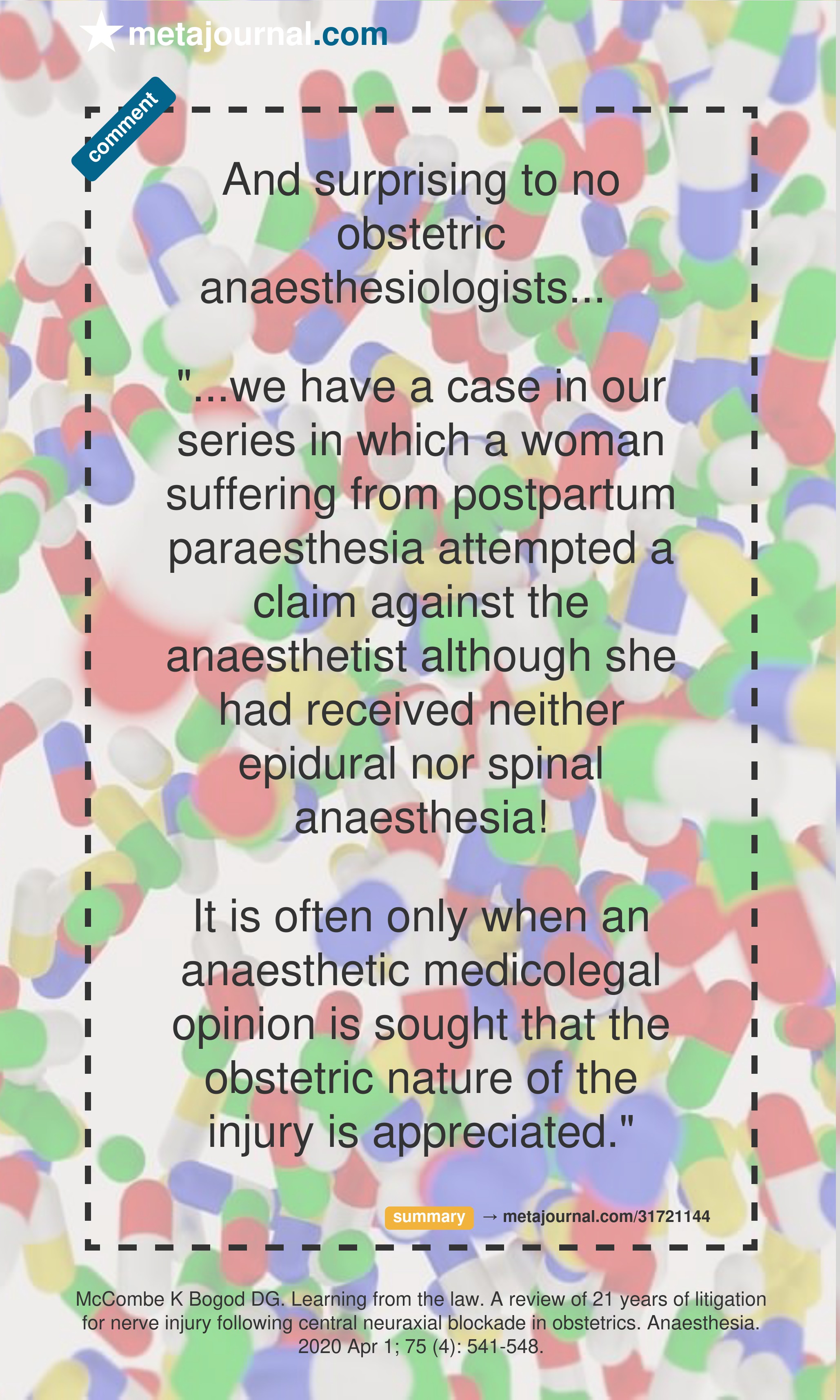 It is often only when an anaesthetic medicolegal opinion is sought that the obstetric nature of the injury is appreciated."