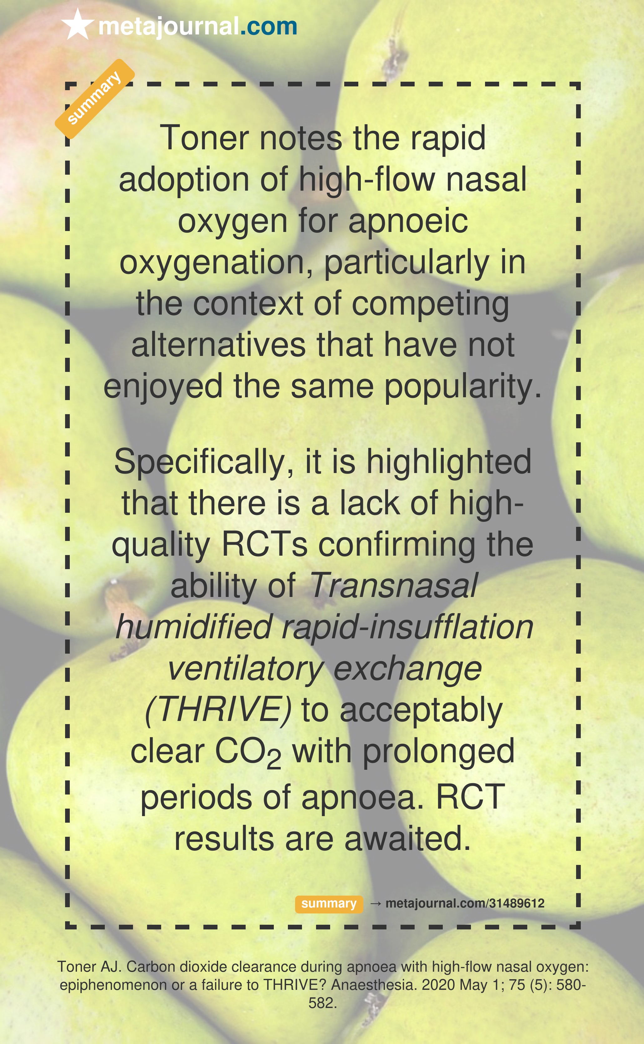 Specifically, it is highlighted that there is a lack of high-quality RCTs confirming the ability of Transnasal humidified rapid-insufflation ventilatory exchange (THRIVE) to acceptably clear CO2 with prolonged periods of apnoea. RCT results are awaited.