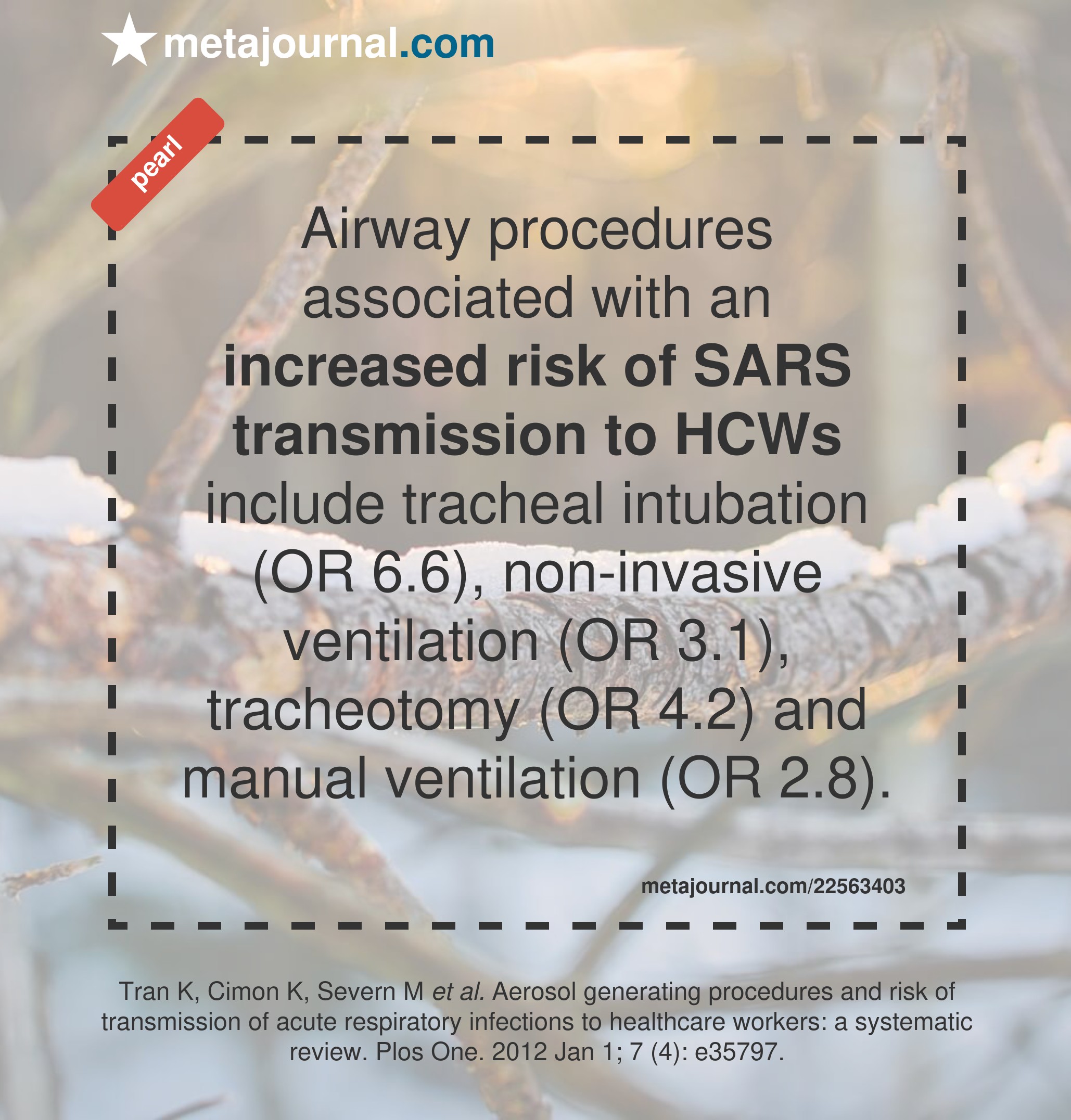 - Intubation is a high-risk procedure for aerosol generation. A ventilated negative pressure room and airborne-precaution PPE is recommended. Ventilation (frequency of air-exchange) is likely more important than negative pressure.1 Chinese evidence suggests COVID transmission at intubation is low with appropriate PPE, although there is wide variability in extremes of PPE used along with post-exposure disinfection (eg. showering).