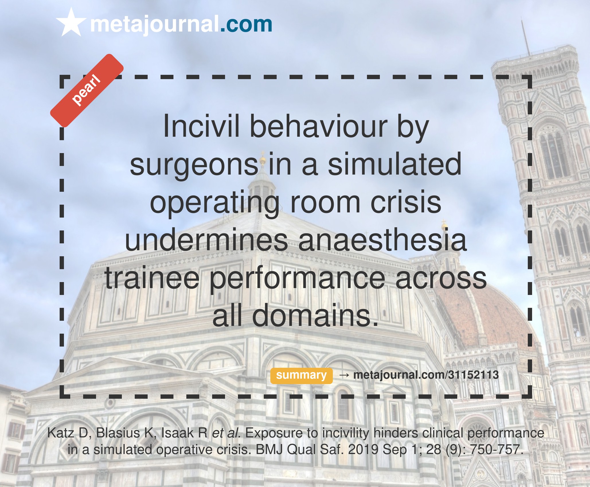 Katz and team set out to identify the effect of incivility on performance during a simulated operating room crisis (intraoperative haemorrhage), noting that multiple surveys show the ubiquity of incivility in surgical and anaesthetic environments.