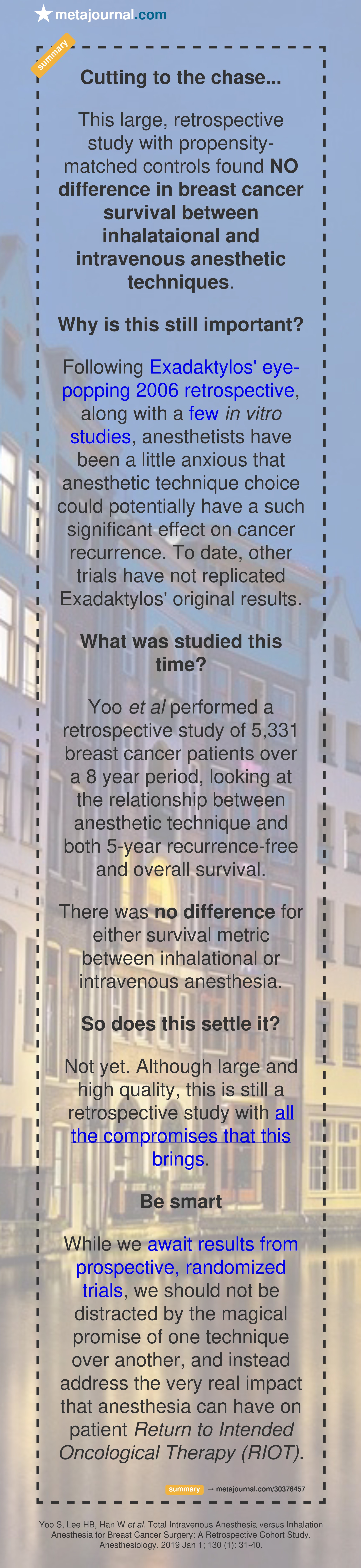 Yoo et al performed a retrospective study of 5,331 breast cancer patients over a 8 year period, looking at the relationship between anesthetic technique and both 5-year recurrence-free and overall survival.