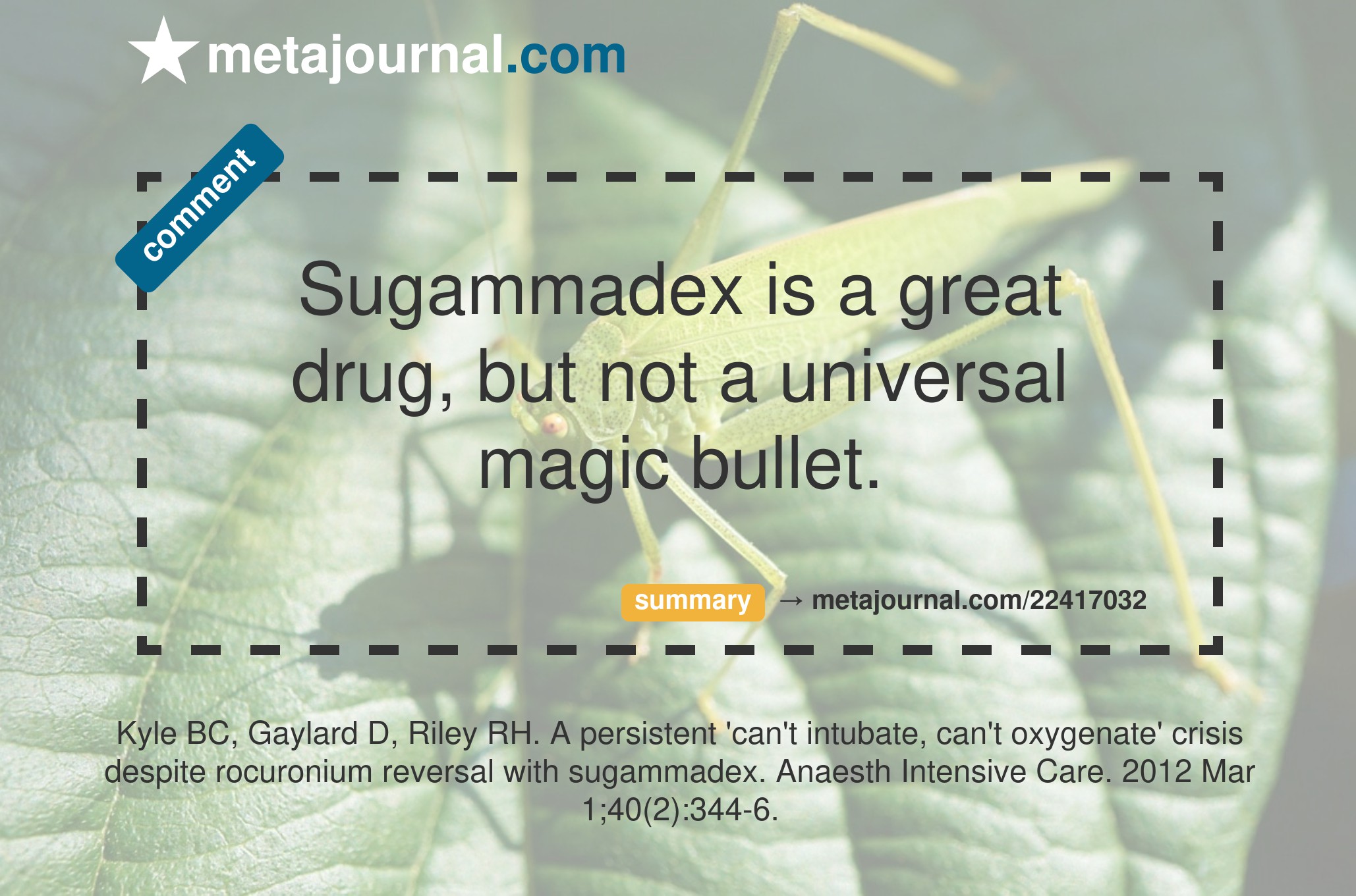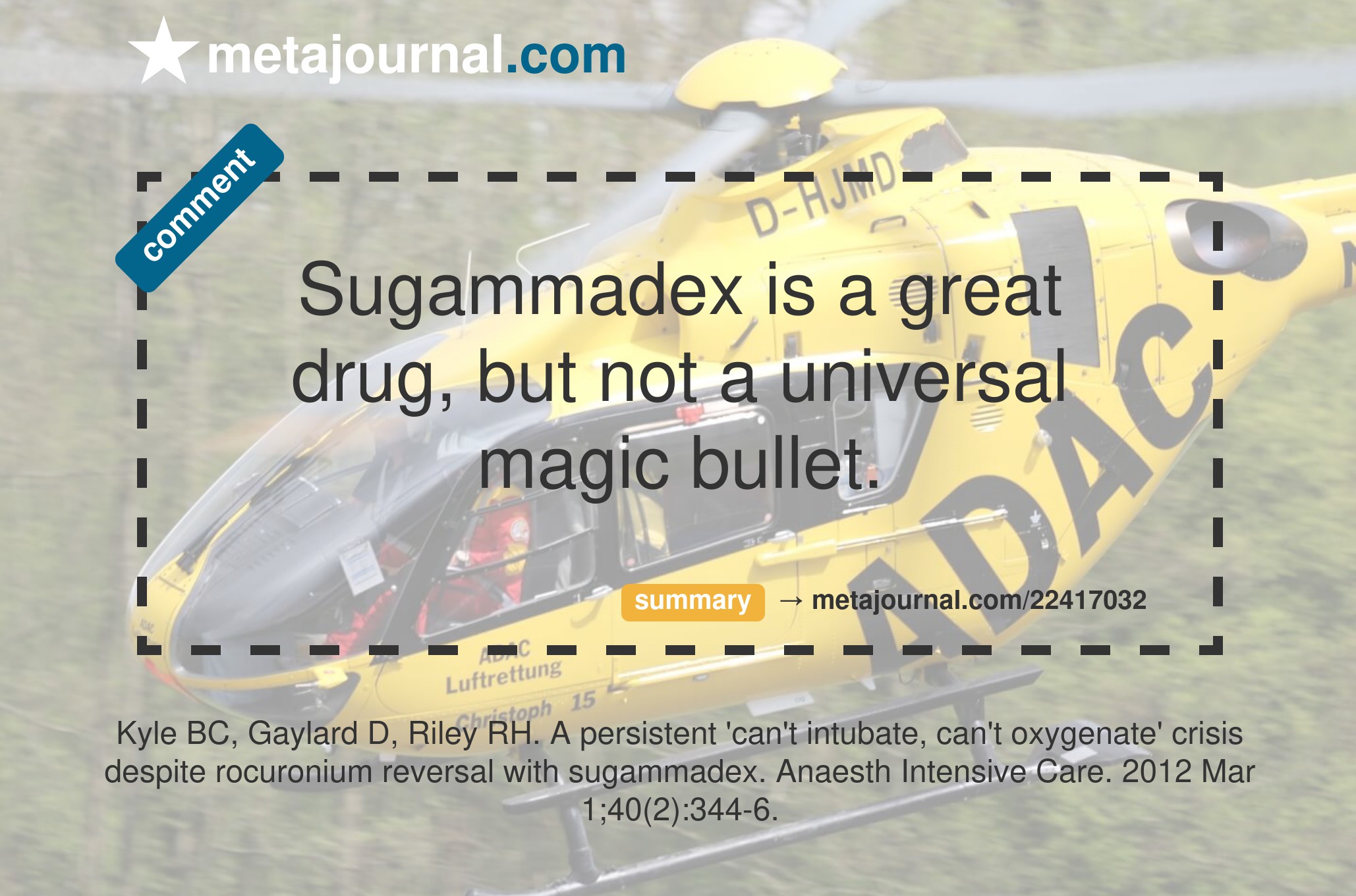 An interesting CICO case study highlighting that while sugammadex will rapidly and completely reverse paralysis, this is only one consideration when managing an airway crisis. The use of any reversal agent in an airway crisis should be considered within the context of the case and a clear understanding of the objective of our actions.