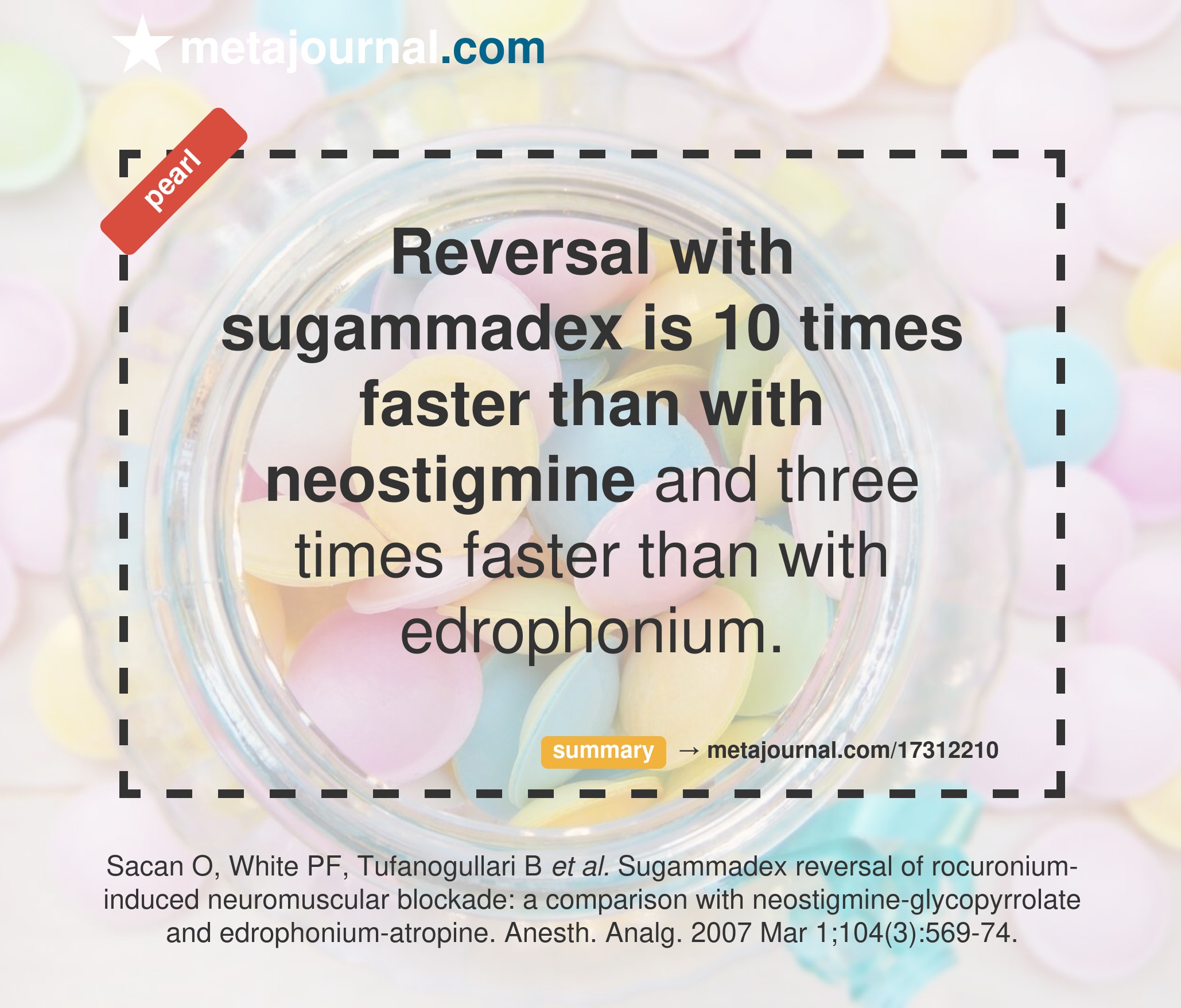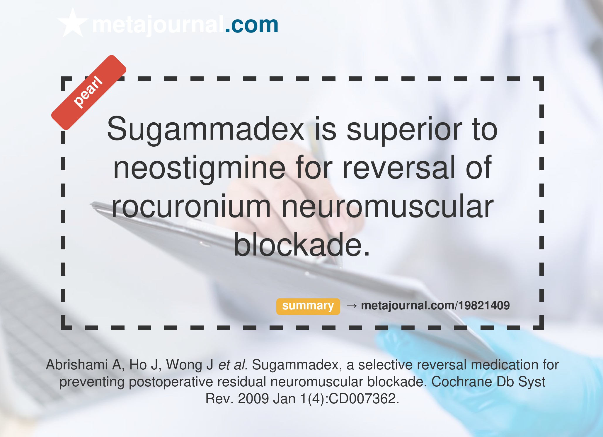 Abrishami et al.'s Cochrane review of 18 RCTs totalling 1,300 patients confirmed the superiority of sugammadex compared with neostigmine at all studied levels of blockade. They identified sugammadex dosing of:
