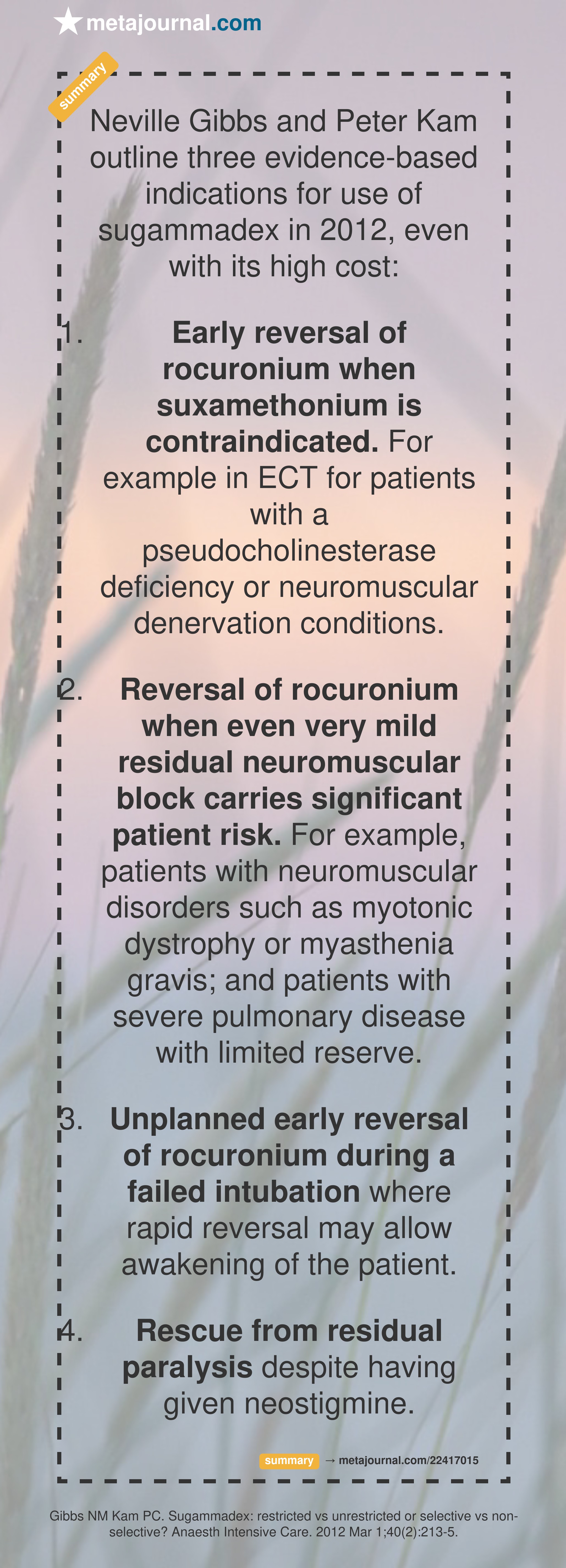 Neville Gibbs and Peter Kam outline three evidence-based indications for use of sugammadex in 2012, even with its high cost: