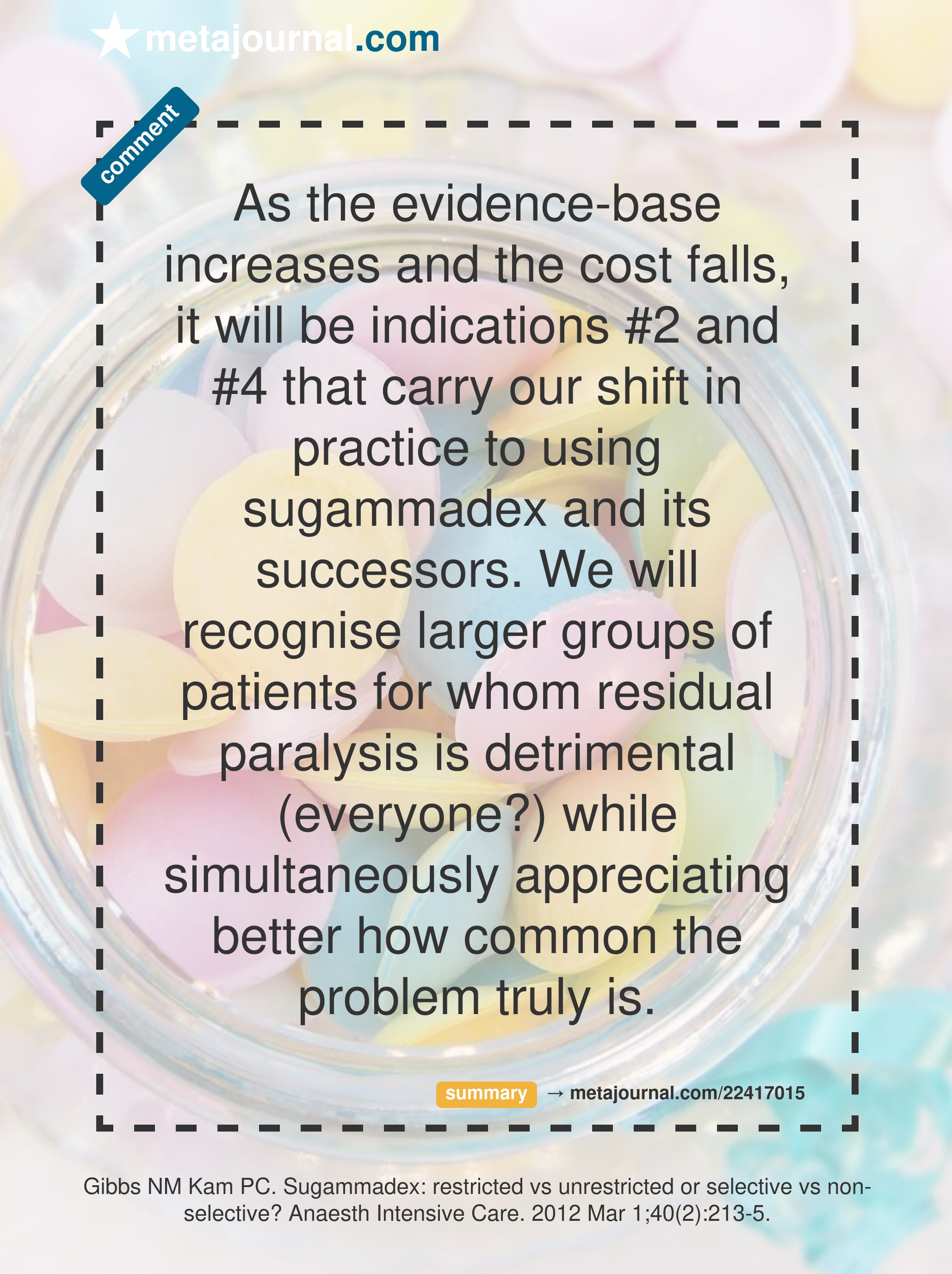 As the evidence-base increases and the cost falls, it will be indications #2 and #4 that carry our shift in practice to using sugammadex and its successors. We will recognise larger groups of patients for whom residual paralysis is detrimental (everyone?) while simultaneously appreciating better how common the problem truly is.