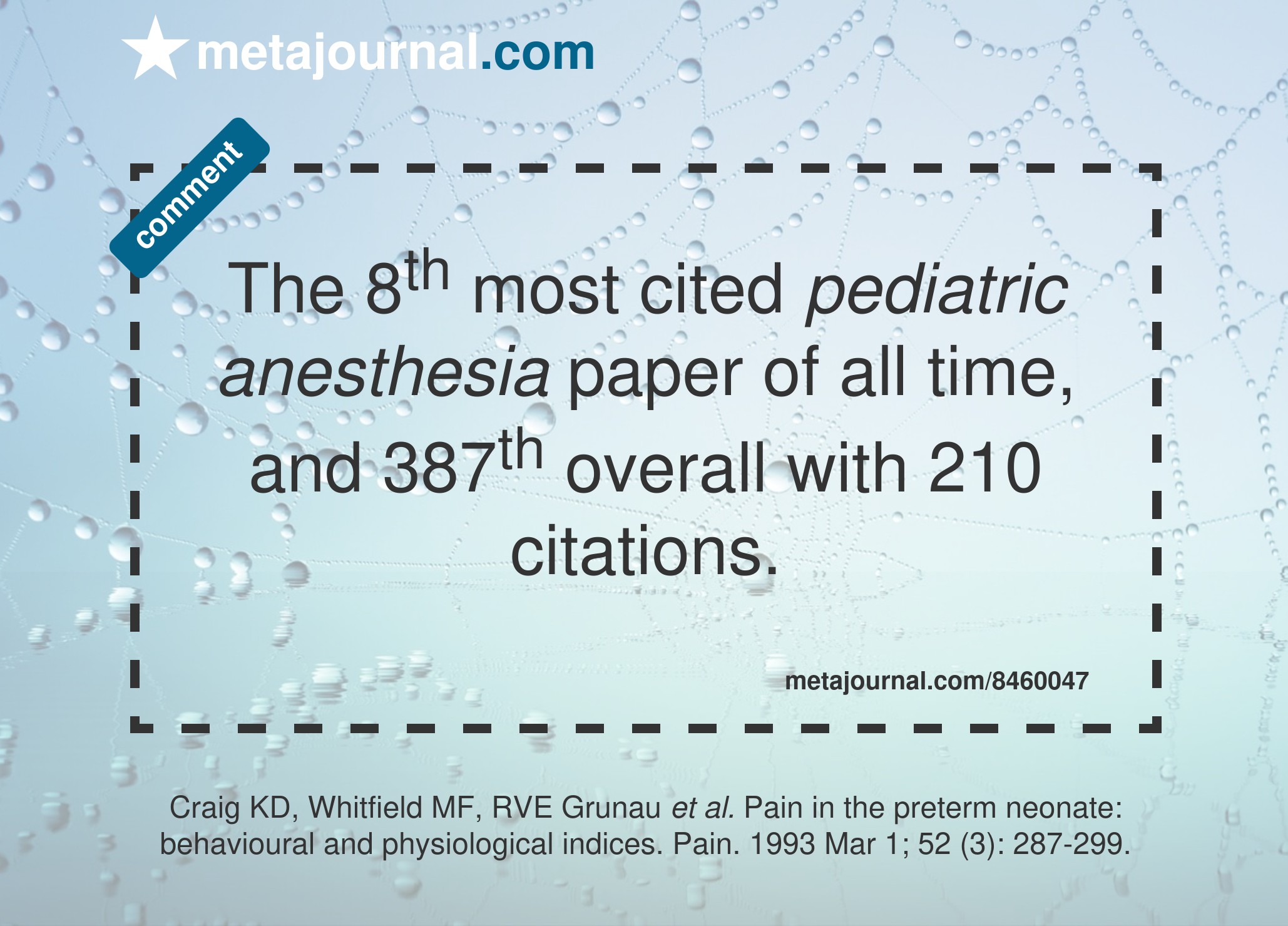 The 8th most cited pediatric anesthesia paper of all time, and 387th overall with 210 citations.