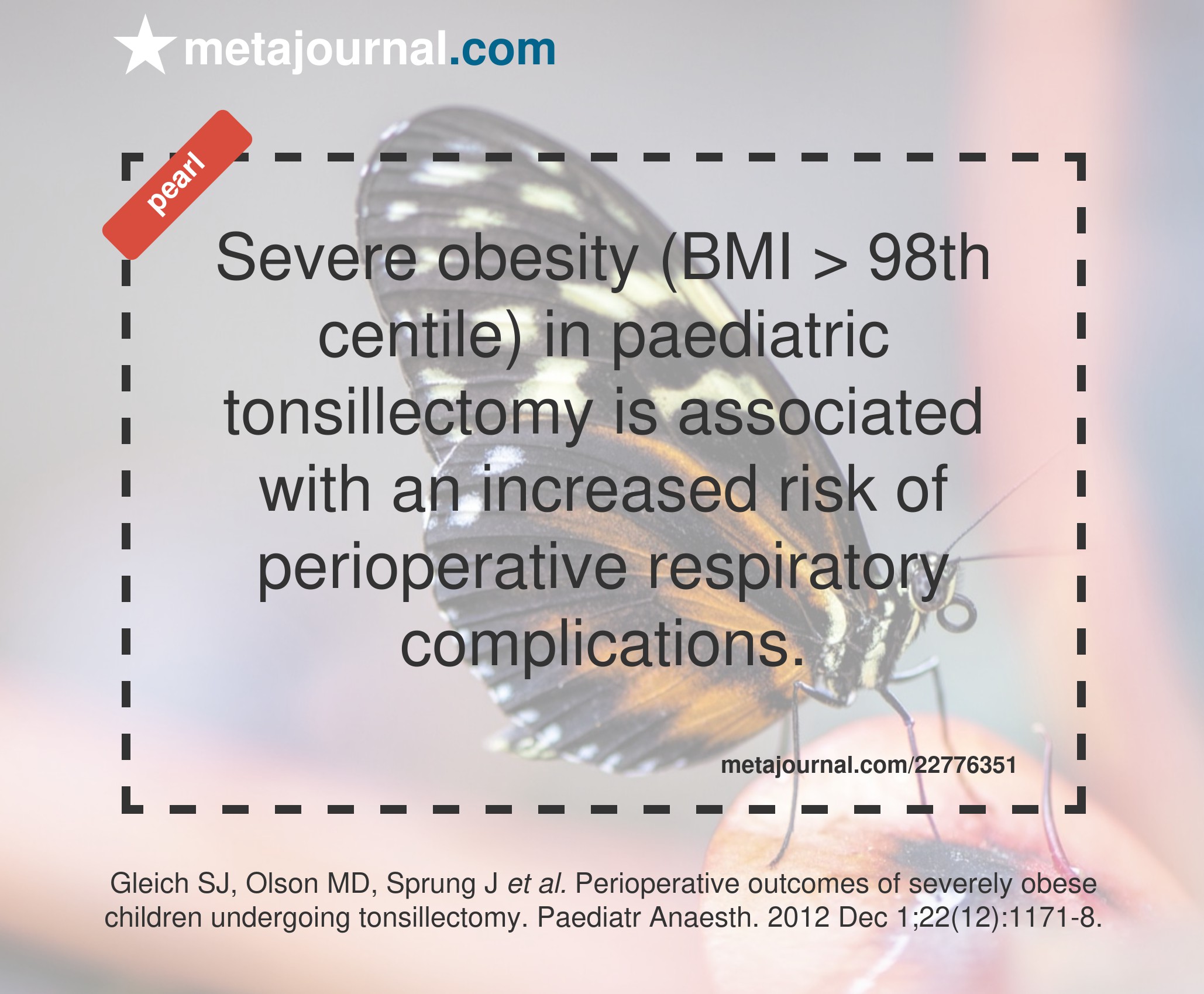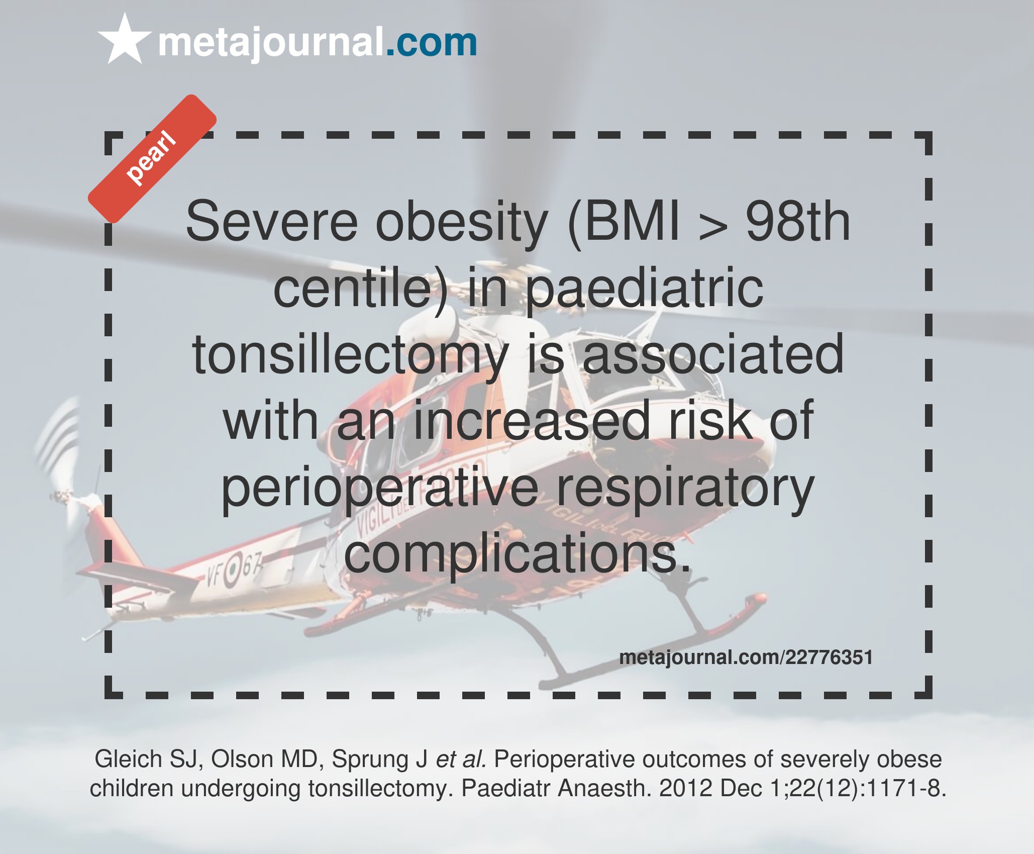 Severe obesity (BMI > 98th centile) in paediatric tonsillectomy is associated with an increased risk of perioperative respiratory complications.