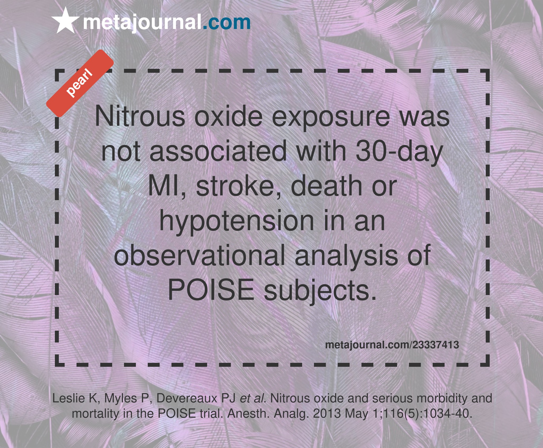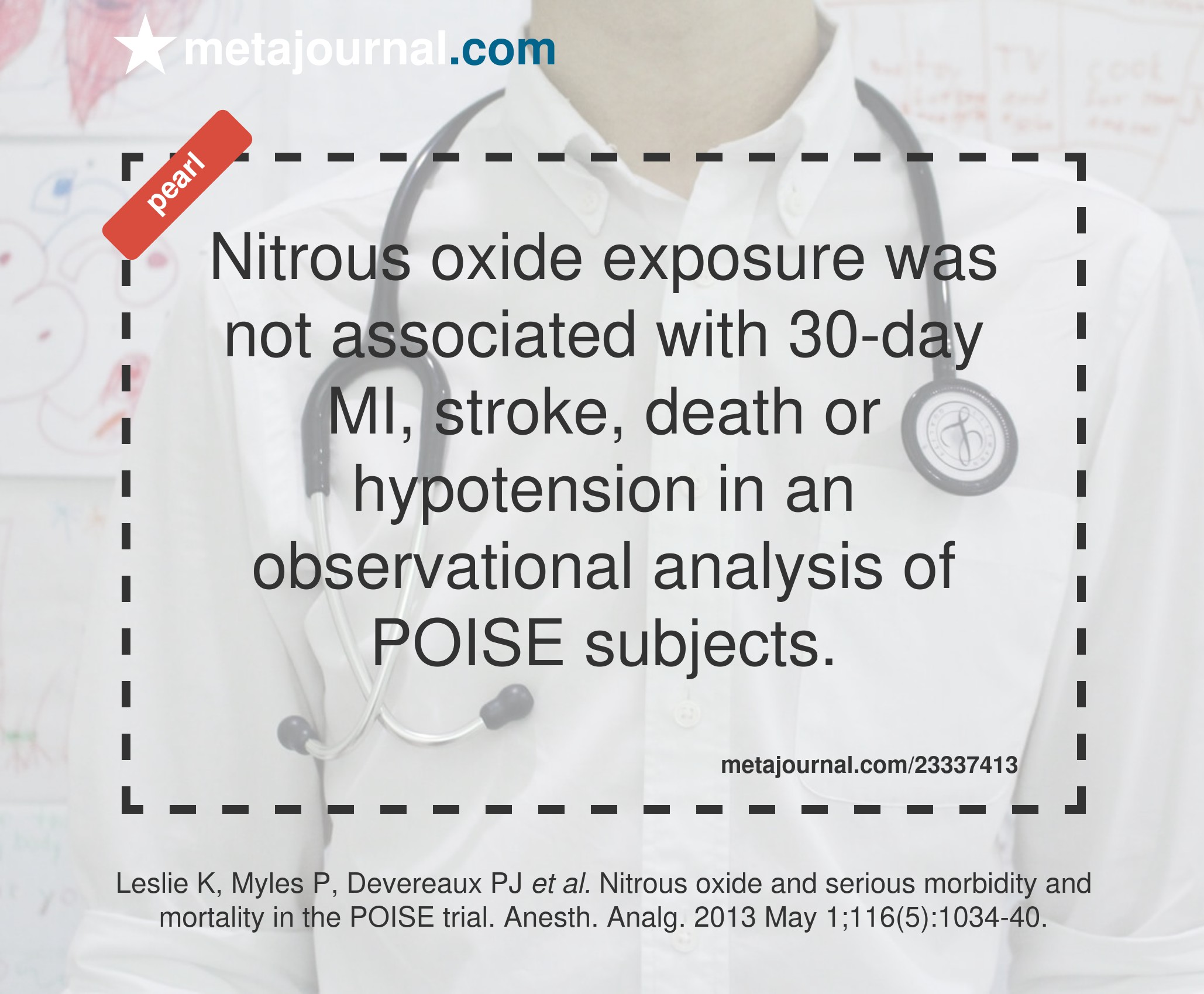 Nitrous oxide exposure was not associated with 30-day MI, stroke, death or hypotension in an observational analysis of POISE subjects.