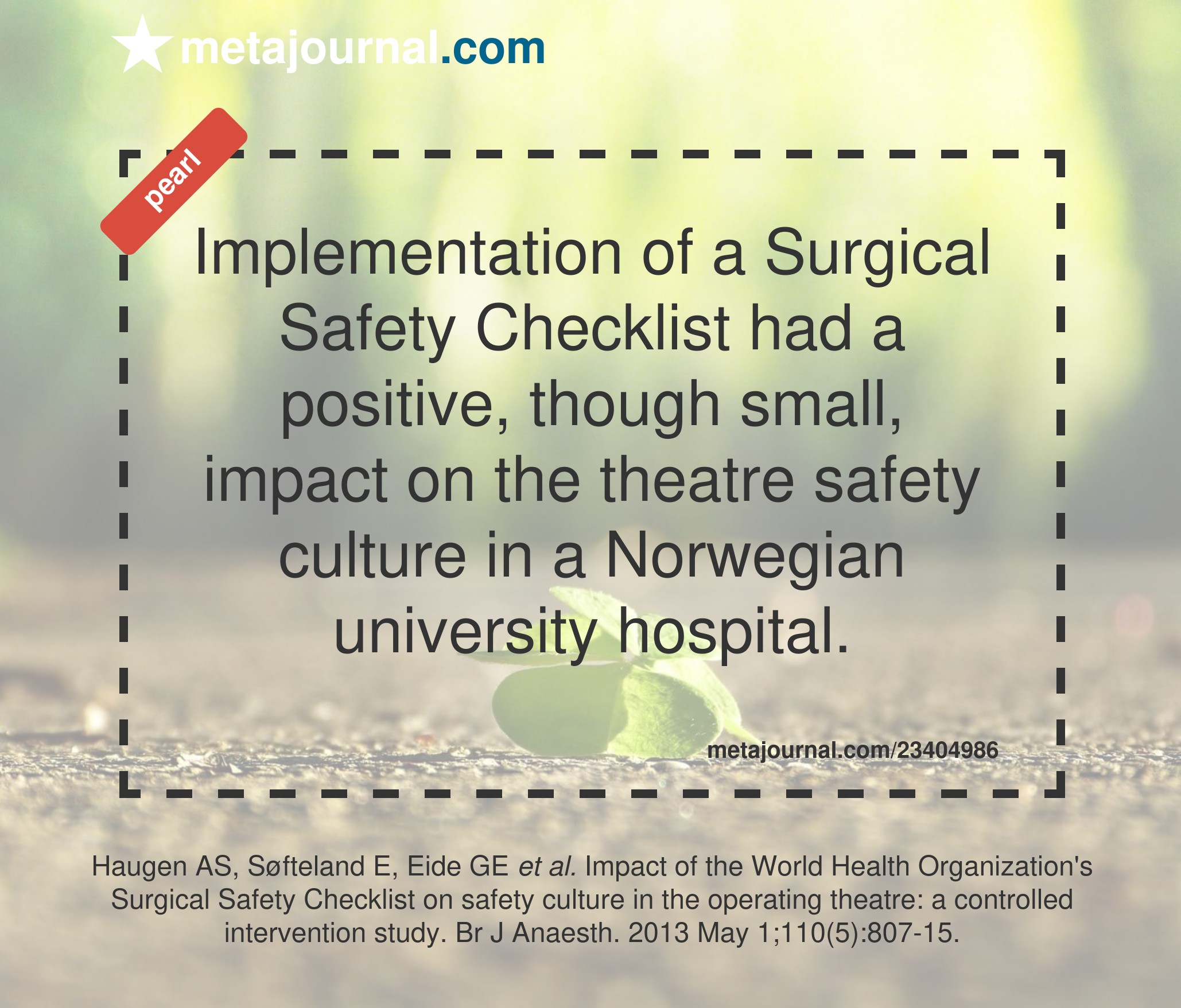 Implementation of a Surgical Safety Checklist had a positive, though small, impact on the theatre safety culture in a Norwegian university hospital.