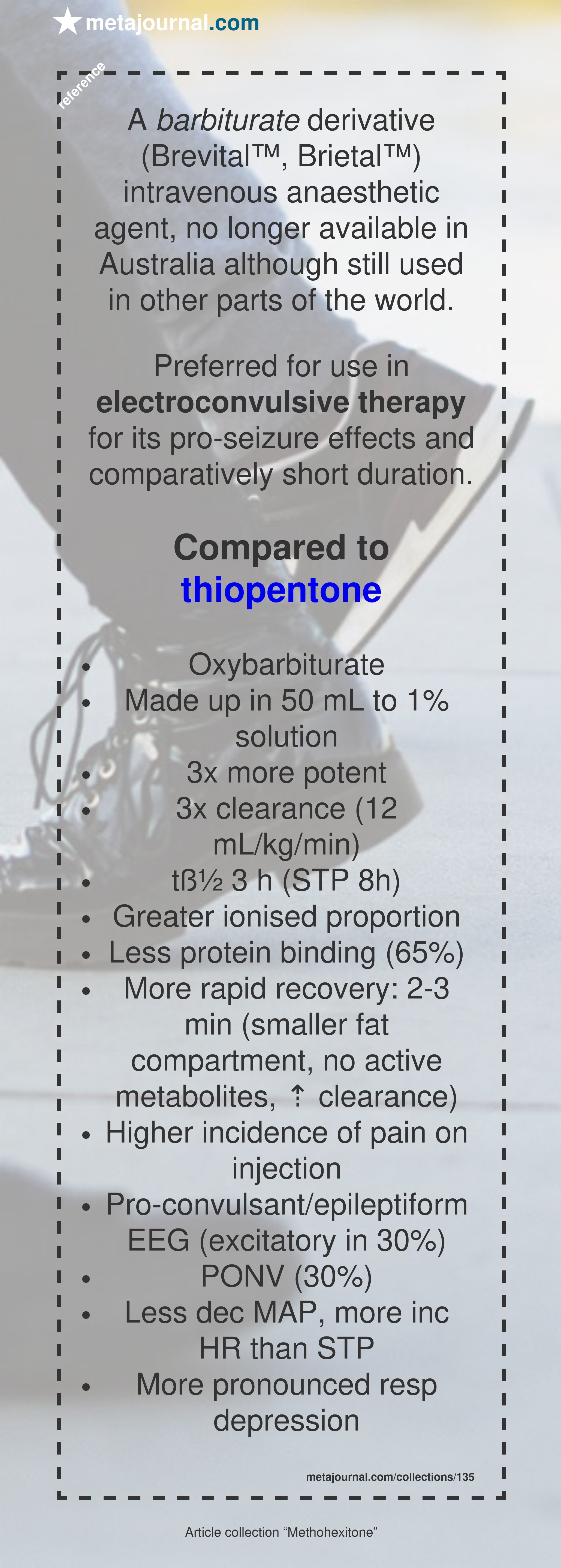 A barbiturate derivative (Brevital™, Brietal™) intravenous anaesthetic agent, no longer available in Australia although still used in other parts of the world.