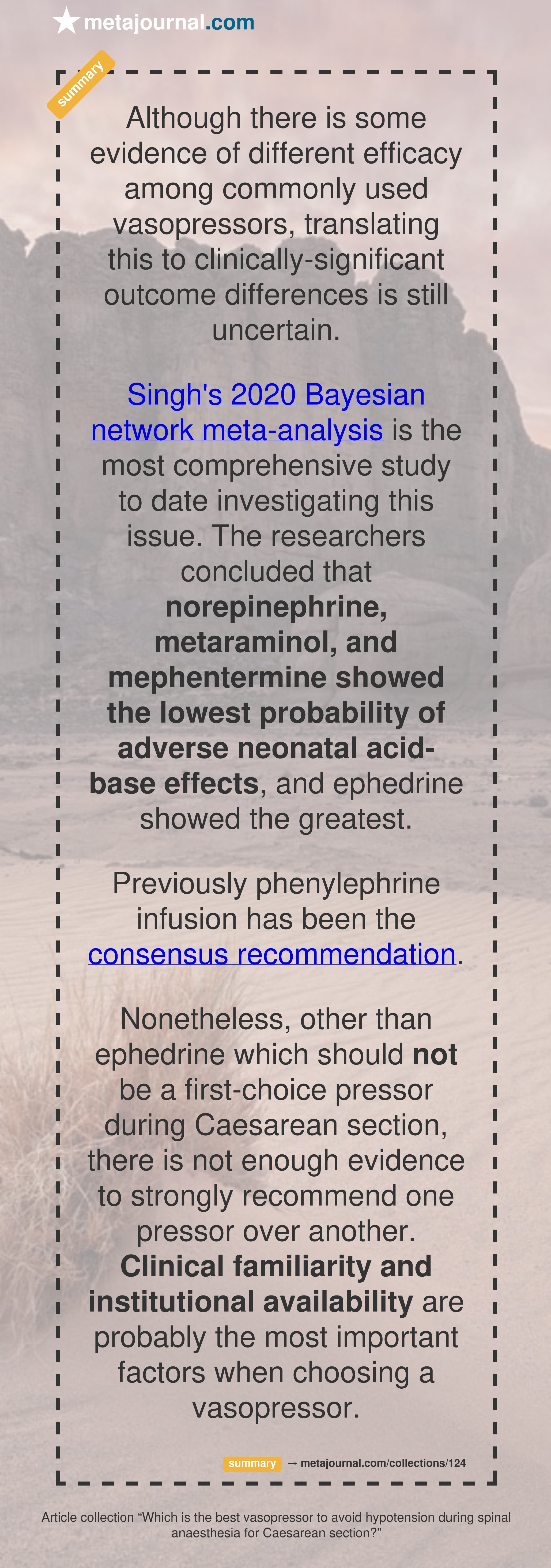Given the very nature of meta-analyses and the challenge of indirect comparison among agents from heterogenous studies, the conclusions are only suggestive of the benefits of phenylephrine alternatives. A large RCT is still needed! (And despite it's popularity in some countries, there are still only a small number of trials of metaraminol.)