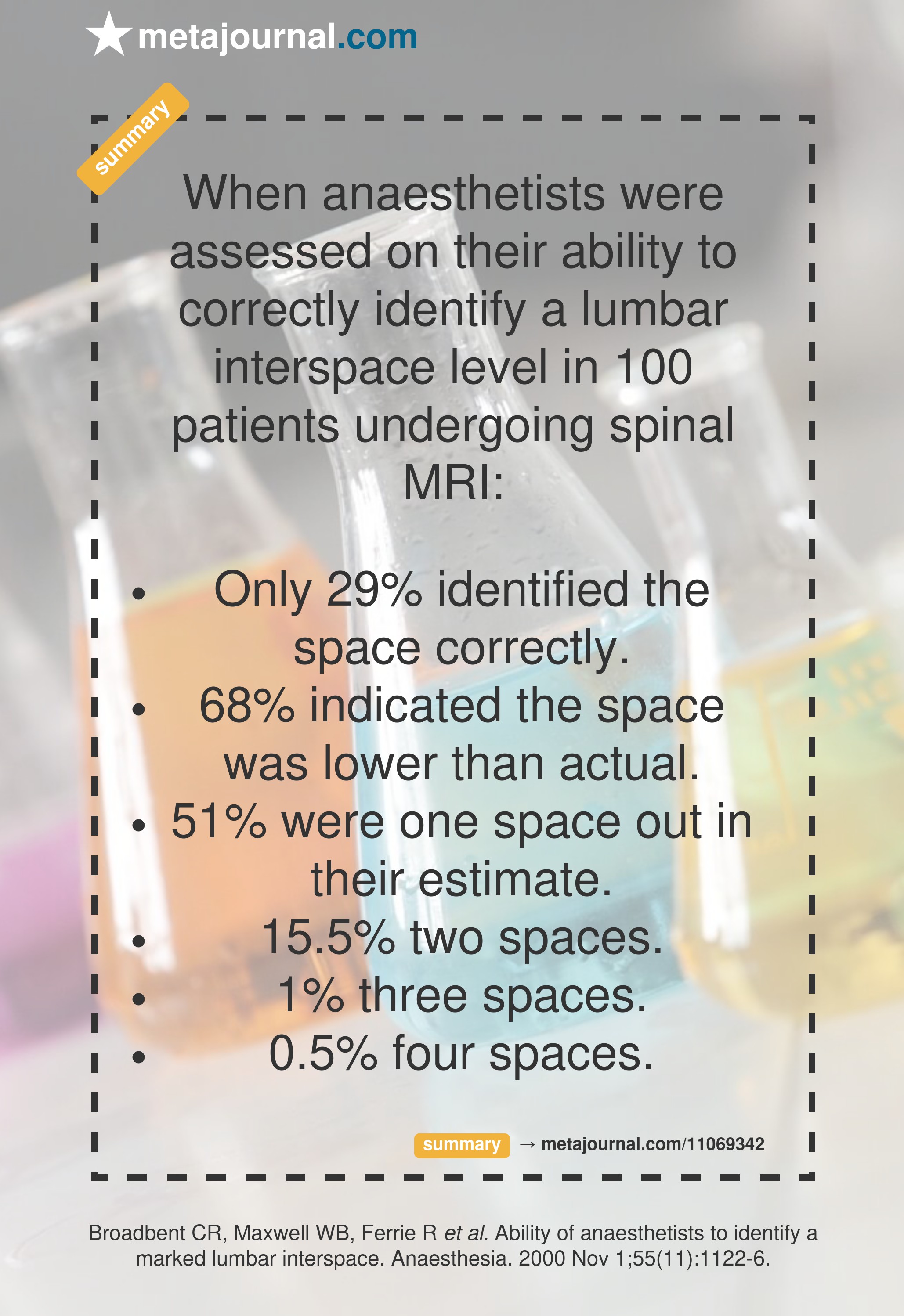 When anaesthetists were assessed on their ability to correctly identify a lumbar interspace level in 100 patients undergoing spinal MRI: