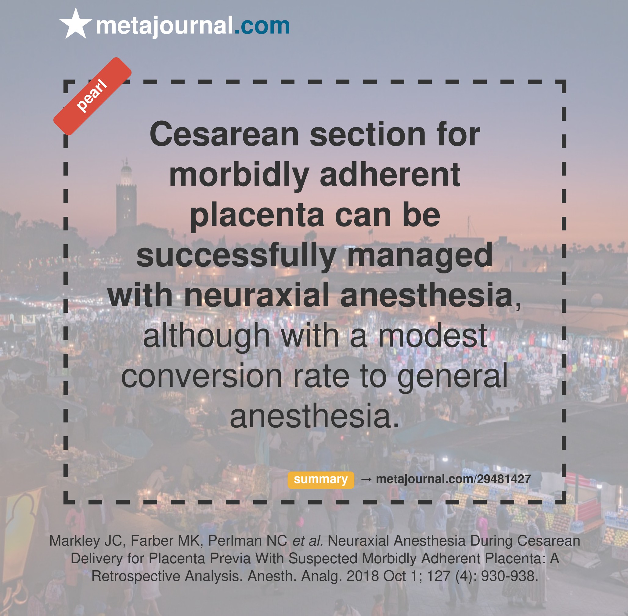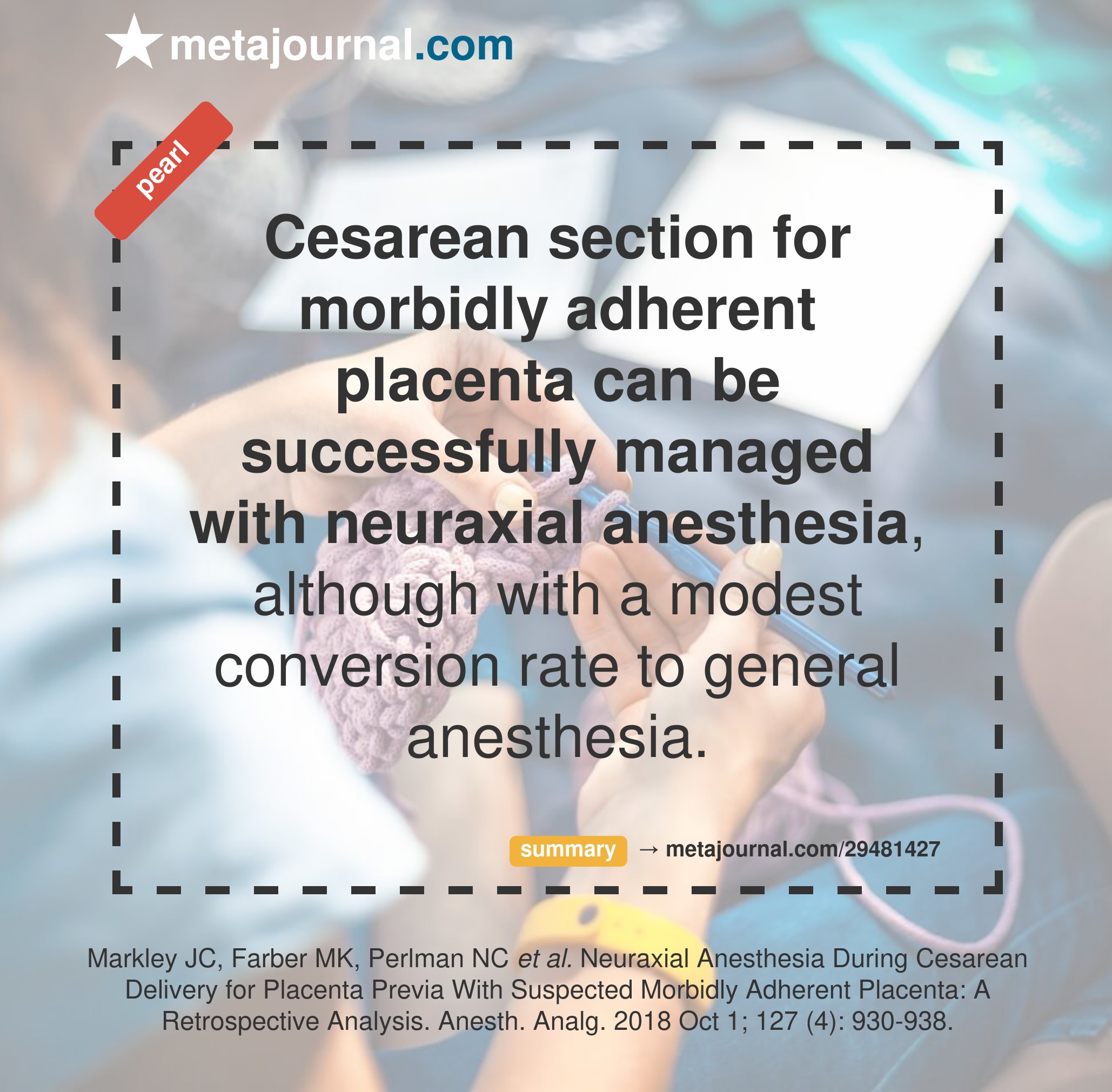 Although retrospective, this data again reassures that neuraxial anesthesia can be a safe and appropriate choice for cesarean delivery with placenta accreta, increta or percreta. The big question will be whether you are happy managing an emergent NA-GA conversion and intubation in the 1-in-8 requiring it (or 1-in-5 with hysterectomy) or plan for an elective GA pre-surgery.