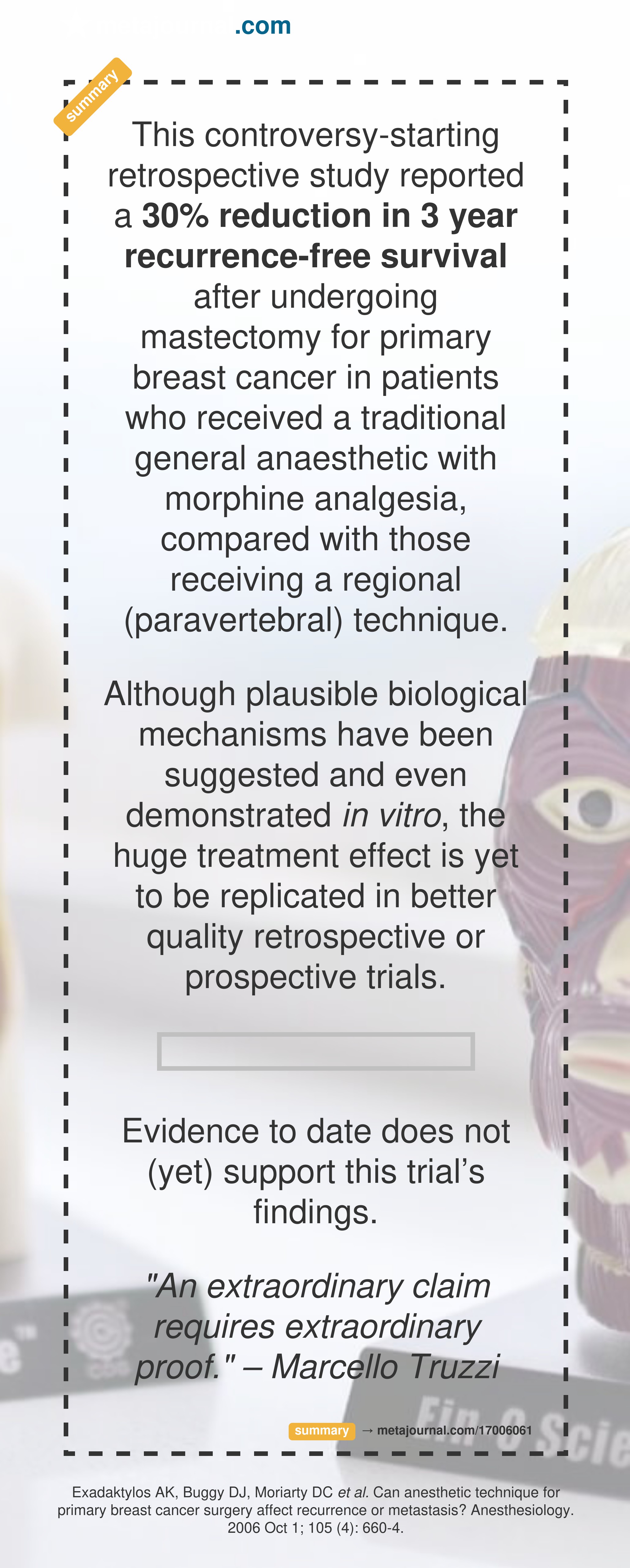 This controversy-starting retrospective study reported a 30% reduction in 3 year recurrence-free survival after undergoing mastectomy for primary breast cancer in patients who received a traditional general anaesthetic with morphine analgesia, compared with those receiving a regional (paravertebral) technique.