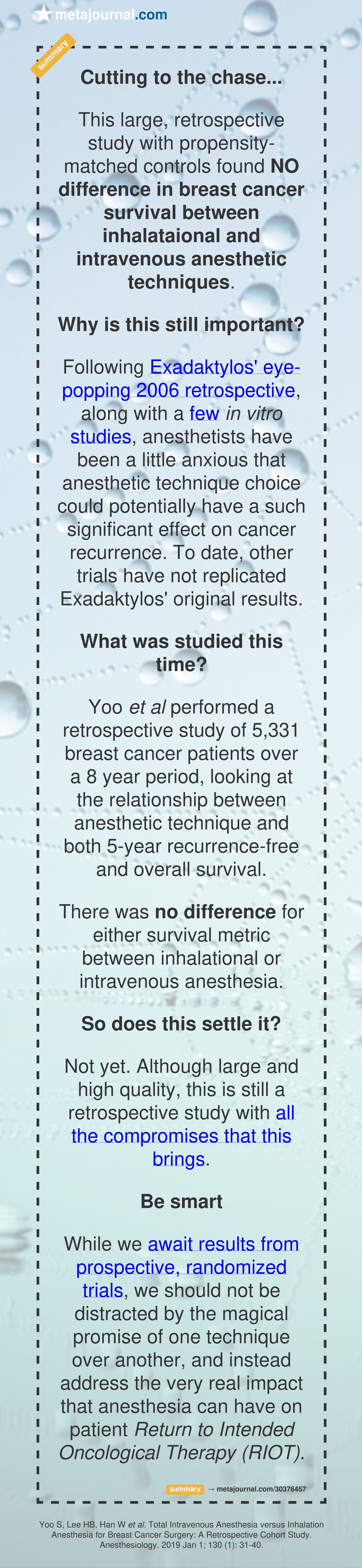 Yoo et al performed a retrospective study of 5,331 breast cancer patients over a 8 year period, looking at the relationship between anesthetic technique and both 5-year recurrence-free and overall survival.