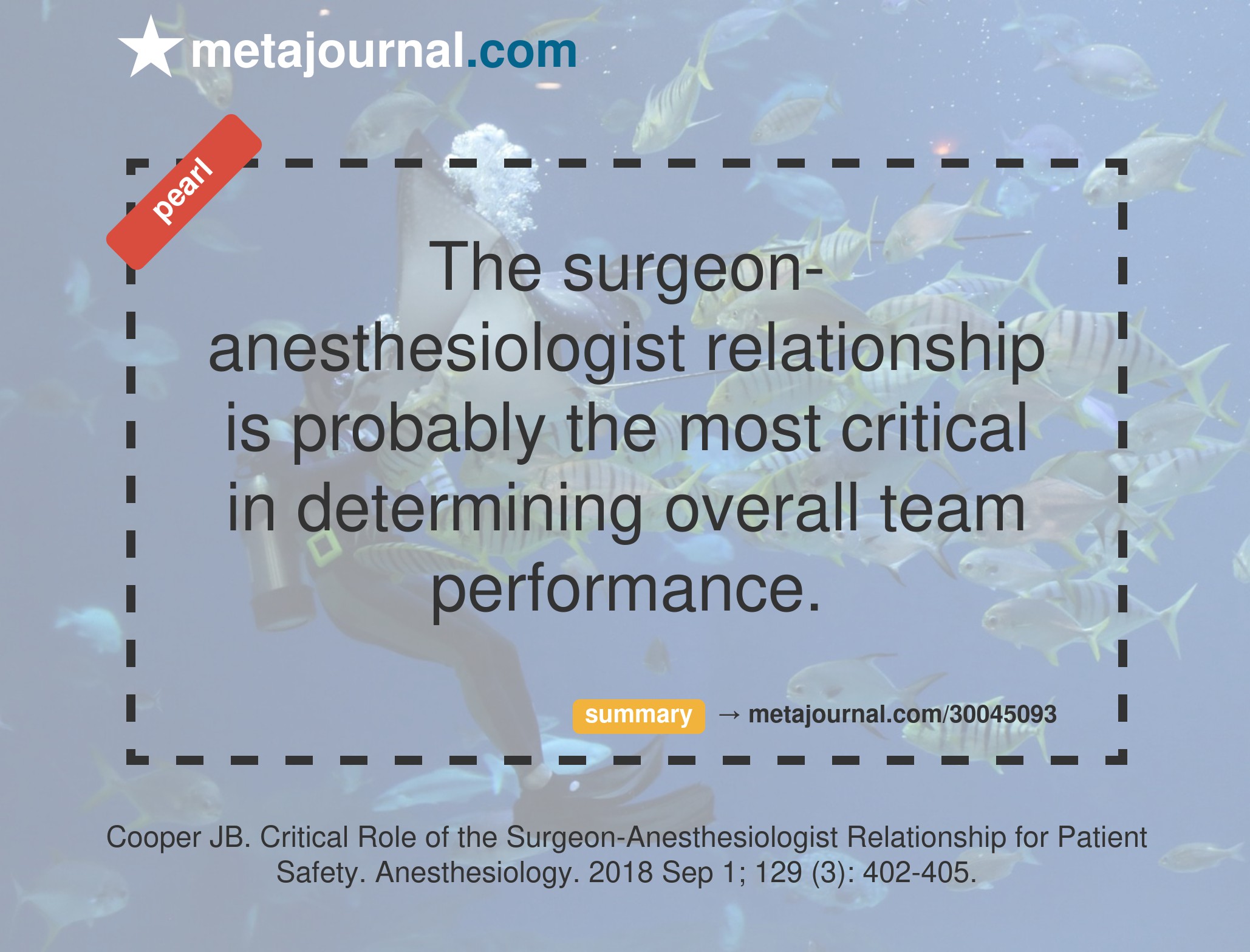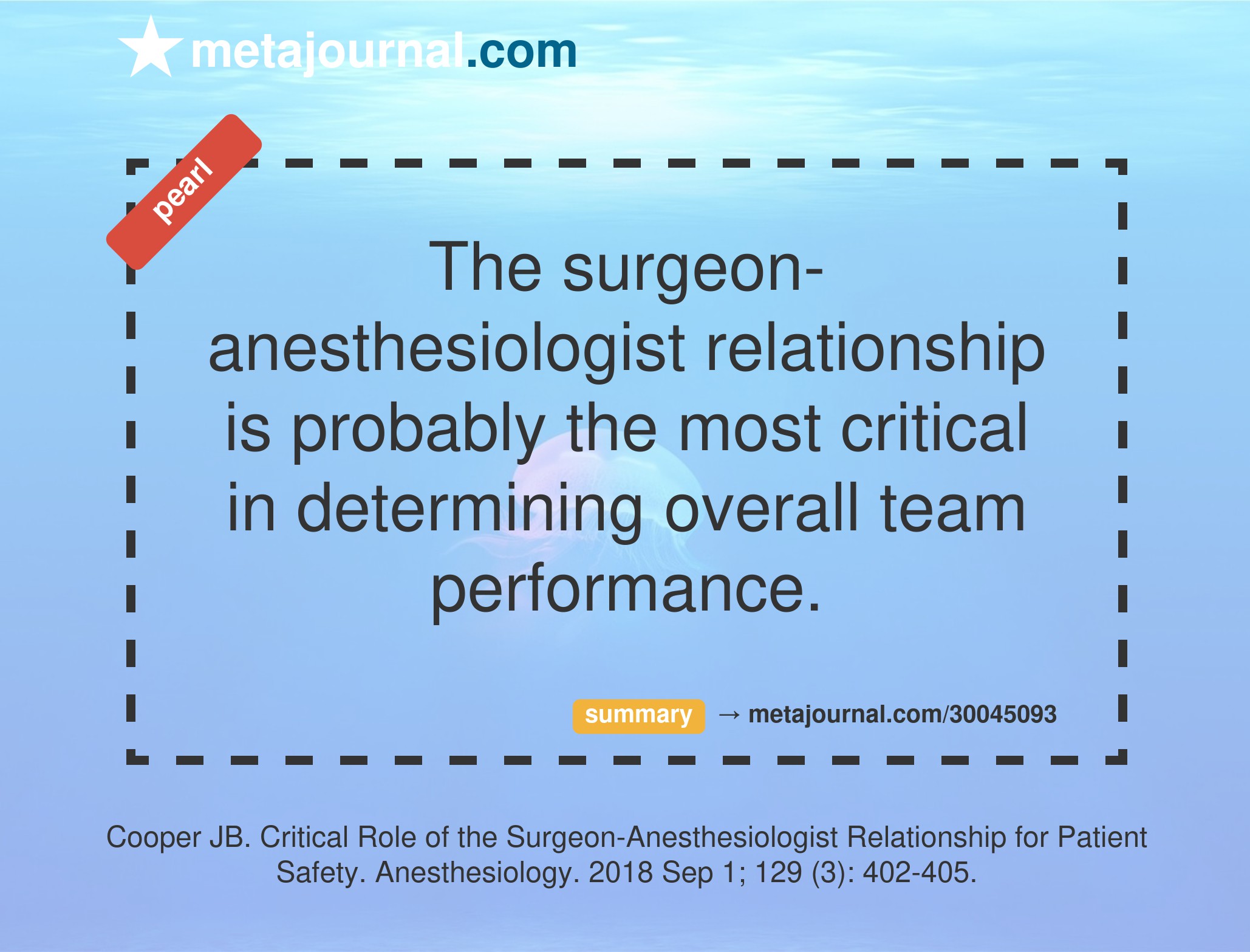 An interesting exploration of the surgeon-anesthesiologist relationship, framed in terms of it being the critical dyad of the operating theatre team.