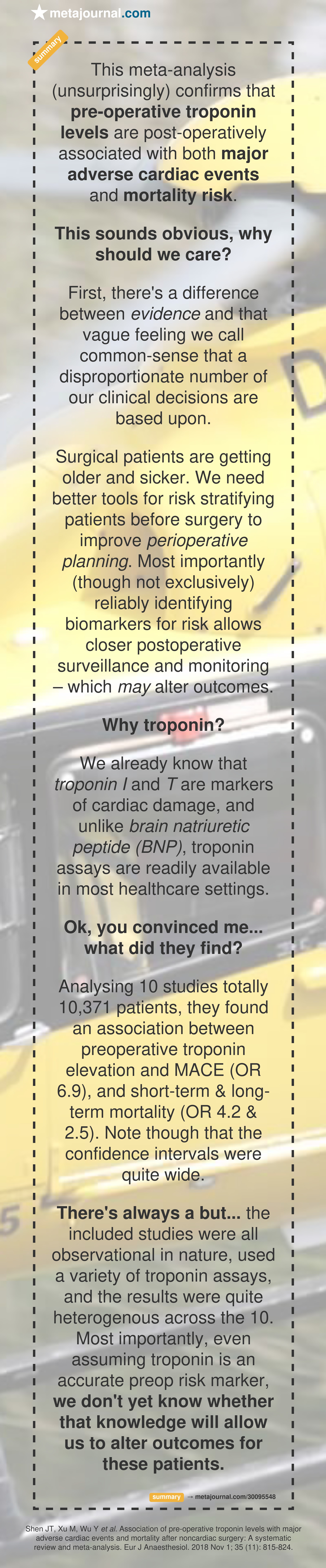There's always a but... the included studies were all observational in nature, used a variety of troponin assays, and the results were quite heterogenous across the 10. Most importantly, even assuming troponin is an accurate preop risk marker, we don't yet know whether that knowledge will allow us to alter outcomes for these patients.