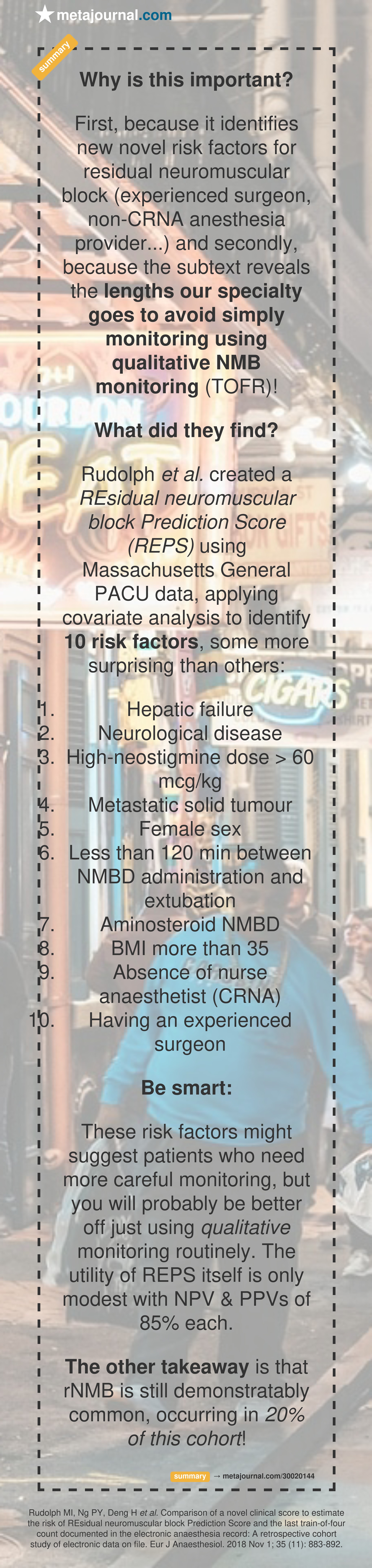 Rudolph et al. created a REsidual neuromuscular block Prediction Score (REPS) using Massachusetts General PACU data, applying covariate analysis to identify 10 risk factors, some more surprising than others: