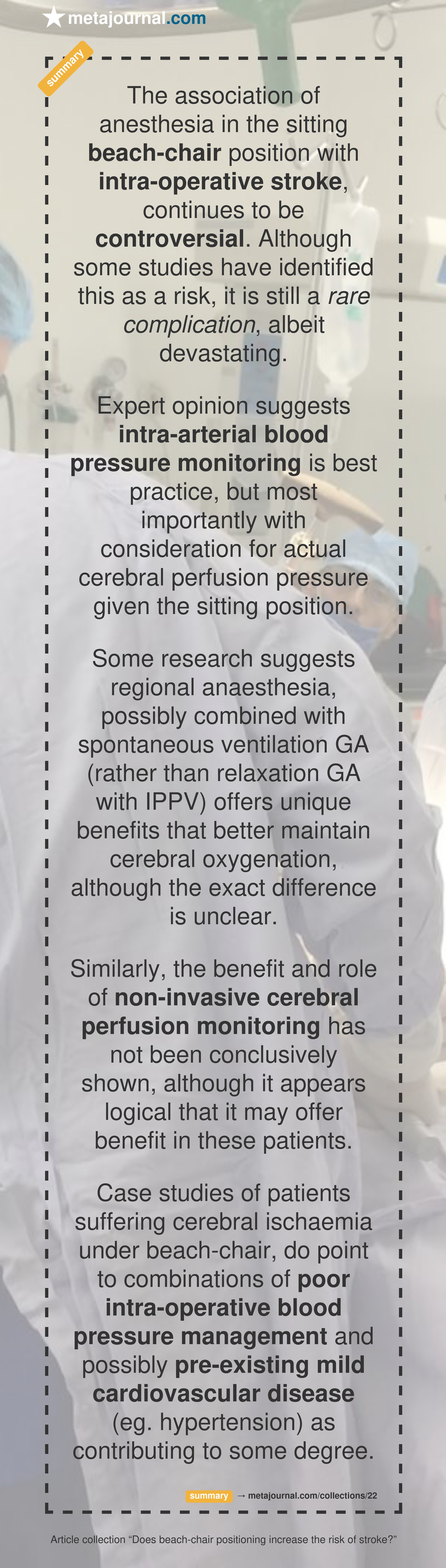 Case studies of patients suffering cerebral ischaemia under beach-chair, do point to combinations of poor intra-operative blood pressure management and possibly pre-existing mild cardiovascular disease (eg. hypertension) as contributing to some degree.